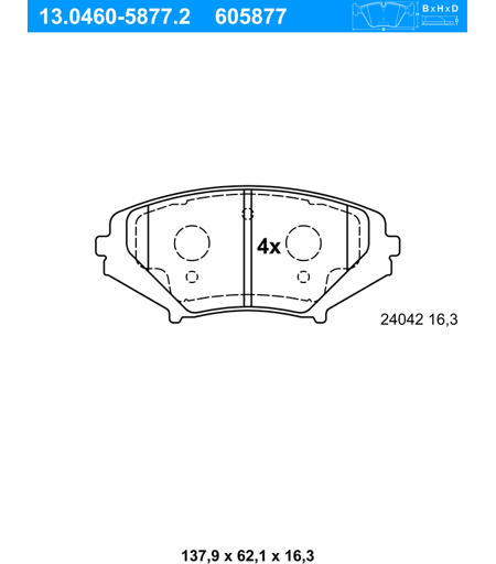 ATE Bremsbelagsatz, Scheibenbremse Dicke/Stärke: 16,3 mm test_mark_190: Prüfzeichen: E9 90R-02A1162/1003 Verschleißwarnkontakt: exkl. Verschleißwarnkontakt Bremssystem: Sumitomo Höhe: 62,1 mm Breite: 137,9 mm Verschleißwarnkontakt: nicht für Verschleißwarnanzeiger vorbereitet MAPP-Code vorhanden:: Menge 1 entspricht einem Satz (4 Bremsbeläge für links UND rechts) , u.a. für Mazda Rx-8 (FE, SE), 1308 cm³, 231 PS (170 kW), 10/2003 bis 6/2012, KBA-Nr: 7118276Mazda Rx-8 (FE, SE), 1308 cm³, 192 PS (141 kW), 10/2003 bis 6/2012, KBA-Nr: 7118275Mazda Rx-8 (FE, SE), 1308 cm³, 241 PS (177 kW), 11/2003 bis 6/2012Mazda Rx-8 (FE, SE), 1308 cm³, 205 PS (151 kW), 4/2008 bis 6/2012, KBA-Nr: 7118ACG , OE-Nummer:FERODO:FSL1758TEXTAR:2404201BREMBO:P 49 034ICER:181670TEXTAR:24042 163 0 4FERODO:FDB1758TRW:GDB3356DELPHI:LP1867HELLA PAGID:8DB 355 010-881PAGID:T1402BREMBO:P49034NHELLA:8DB 355 010-881NK:223247MINTEX:MDB2589 ...