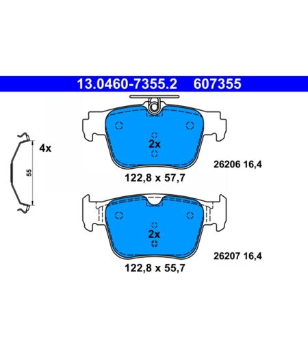 Anzahl der Beläge: 4. Breite [mm]: 122,8. Bremssystem: ATE. Dicke [mm]: 16,4. Hersteller: ATE. Herstellernummer: 13.0460-7355.2. Höhe [mm]: 57,7, 55,7. Index: 13.0460-7355.2. Material: Low-Metallic. Montage Achse: Hinten. Produktart: Bremsbelagsatz. Typprüfung: E1 90R-02A0333/0725. Verschleißkontakt: Nein. Vorbereitung für Verschleißkontakt: Nein. WVA-Nummer: 26206. ...