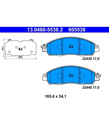 Anzahl Verschleißanzeiger [pro Achse]: 4. Anzahl der Beläge: 4. Anzahl der Federn: 4. Breite [mm]: 165,6. Dicke [mm]: 17. Hersteller: ATE. Herstellernummer: 13.0460-5538.2. Höhe [mm]: 54,1. Index: 13.0460-5538.2. Material: Low-Metallic. Montage Achse: Vorne. Produktart: Bremsbelagsatz. Typprüfung: E9 90R-02A1162/4416. Verschleißkontakt: Ja. Verschleißkontakttyp: akustisch. WVA-Nummer: 22439 22440. ...