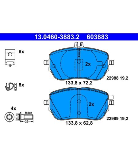Anzahl Verschleißanzeiger [pro Achse]: 2. Anzahl der Beläge: 4. Anzahl der Federn: 8. Anzahl der Schrauben: 4. Breite [mm]: 133,8. Bremssystem: CBI. Dicke [mm]: 19,2. Hersteller: ATE. Herstellernummer: 13.0460-3883.2. Höhe [mm]: 72,2, 62,8. Index: 13.0460-3883.2. Material: Low-Metallic. Montage Achse: Vorne. Produktart: Bremsbelagsatz. Typprüfung: E9 90R-02A1248/5312. Verschleißkontakt: Nein. Vorbereitung für Verschleißkontakt: Ja. WVA-Nummer: 22988. ...