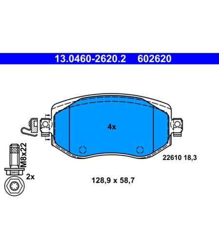 Anzahl Verschleißanzeiger [pro Achse]: 8. Anzahl der Beläge: 4. Anzahl der Federn: 8. Anzahl der Schrauben: 2. Breite [mm]: 128,9. Bremssystem: Lucas / TRW. Dicke [mm]: 18,3. Hersteller: ATE. Herstellernummer: 13.0460-2620.2. Höhe [mm]: 58,7. Index: 13.0460-2620.2. Material: Low-Metallic. Montage Achse: Vorne. Produktart: Bremsbelagsatz. Typprüfung: E1 90R-02A0335/0462. Verschleißkontakt: Nein. Vorbereitung für Verschleißkontakt: Nein. WVA-Nummer: 22610. ...