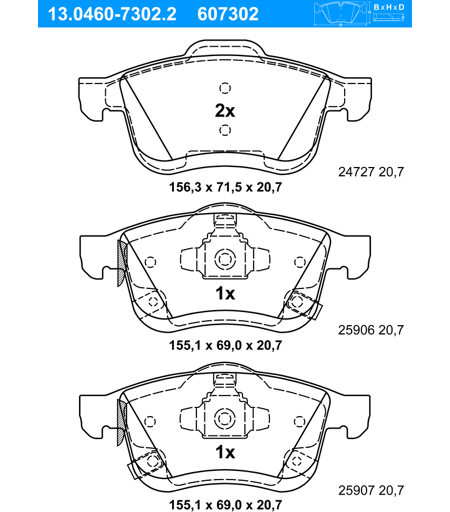 ATE Bremsbelagsatz, Scheibenbremse Breite 1: 155,1 mm Dicke/Stärke: 20,7 mm Verschleißwarnkontakt: mit akustischer Verschleißwarnung Höhe 1: 69 mm Höhe 2: 71,5 mm Bremssystem: ATE Breite 2: 156,3 mm test_mark_190: Prüfzeichen: E1 90R-02A0308/0162 MAPP-Code vorhanden:: Menge 1 entspricht einem Satz (4 Bremsbeläge für links UND rechts) , u.a. für Fiat 500l (351, 352), 1598 cm³, 120 PS (88 kW), ab 9/2013, KBA-Nr: 1727ABMFiat 500l (351, 352), 1368 cm³, 120 PS (88 kW), ab 10/2013, KBA-Nr: 1727ABGFiat 500l (351, 352), 1368 cm³, 120 PS (88 kW), ab 2/2014, KBA-Nr: 1727ABH , OE-Nummer:ZIMMERMANN:25906.200.1FTE:BL2798A1BREMBO:P 23 155NK:2223101TRW:GDB2060GALFER:G1201339VALEO:601414TEXTAR:2590601REMSA:1183.42ICER:182165VALEO:302163HELLA:8DB 355 021-451HELLA PAGID:8DB 355 021-451ROADHOUSE:21183.42GALFER:B1.G120-1339.2MINTEX:MDB3424 ...