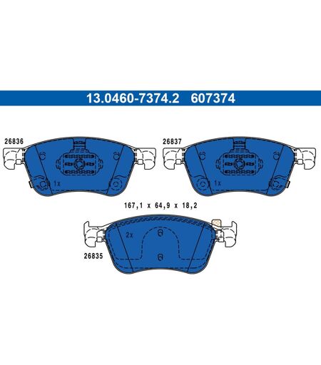 Breite [mm]: 167,1. Bremssystem: ATE. Dicke [mm]: 18,2. Hersteller: ATE. Herstellernummer: 13.0460-7374.2. Höhe [mm]: 64,9. Index: 13.0460-7374.2. Montage Achse: Vorne. Produktart: Bremsbelagsatz. Typprüfung: E1 90R-02A2518/2526. Verschleißkontakt: Ja. Verschleißkontakttyp: akustisch. ...