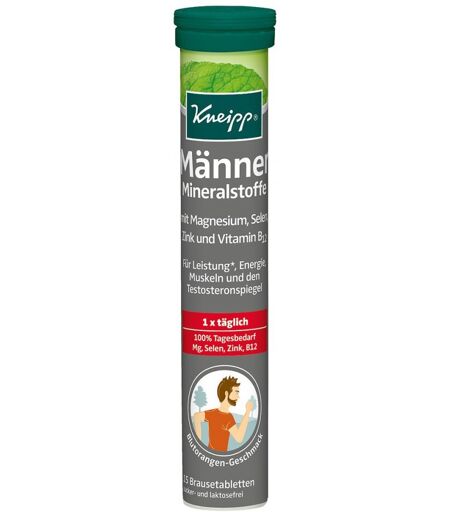 Anwendungsgebiet von Kneipp Männer Mineralstoffe BrausetablettenKneipp Männer Mineralstoffe Brausetabletten ist eine Nahrungsergänzung für Leistung*, Energie, Muskeln und den Testosteronspiegel.Wirkungsweise von Kneipp Männer Mineralstoffe Brausetabletten* Magnesium und Vitamin B12 tragen zu einem normalen Energiestoffwechsel und zur Verringerung von Müdigkeit und Ermüdung bei. Magnesium trägt zu einer normalen Muskelfunktion bei. Zink trägt zur Erhaltung eines normalen Testosteronspiegels im Blut bei. Selen trägt zu einer normalen Spermabildung und zu einer normalen Funktion des Immunsystems bei. Wirkstoffe / Inhaltsstoffe / ZutatenZutaten von Kneipp Männer Mineralstoffe Brausetabletten: Säuerungsmittel: Citronensäure Magnesiumcarbonat, Säureregulator: Natriumhydrogencarbonat Säuerungsmittel: Äpfelsäure natürliche Aromen, Maisstärke, Rote Beete Saftpulver (Maltodextrin, Rote Beete Saftkonzentrat), Süßungsmittel: Natriumcyclamat Zinksulfat, Calciumcarbonat, Süßungsmittel: Saccharin-Natrium, Farbstoff: Riboflavin-5´- Phosphat Natriumselenit, Vitamin B12. pro Tagesdosis 1 Brausetablette: 375 mg (100%*) Magnesium, 10 mg (100%*) Zink, 55 µg (100%*) Selen, 2,5 µg (100%*) Vitamin B12. * Referenzmenge für die tägliche Zufuhr gemäß EU-Verordnung 1169/2011. GegenanzeigenBei bekannter Überempfindlichkeit gegen einen der Inhaltsstoffe sollte dieses Produkt nicht angewendet werden.DosierungAnwendungsempfehlung der Kneipp Männer Mineralstoffe Brausetabletten:Täglich 1 Brausetablette von Kneipp Männer Mineralstoffe Brausetabletten in einem Glas Wasser (ca. 200 ml) aufgelöst trinken. HinweiseNahrungsergänzungsmittel sind kein Ersatz für eine ausgewogene und abwechslungsreiche Ernährung. Kneipp Männer Mineralstoffe Brausetabletten sollten außerhalb der Reichweite von Kindern aufbewahrt werden. Die täglich empfohlene Verzehrmenge sollte nicht überschritten werden. Magnesiumpräparate können ...
