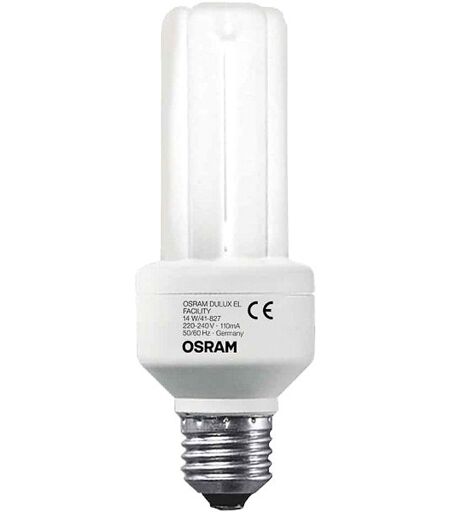 Kompaktleuchtstofflampe DULUX® EL FACILITY: Hersteller: Osram, Artikelbezeichnung: Leuchtstofflampe, Typen-Bezeichnung: DULUXELFCY10W/827, Hersteller-ArtNr: ELFCY10W827E14, E.A.N.: 4050300938295, Lampenleistung: 10 W, Lampenspannung: 240 V, Mittlere Nennlebensdauer: ca. 5000 h, Lichtstrom: 500 lm, Sockel: E14, Lampenform: Standard, Farbtemperatur: 2500 K, Durchmesser: 45 mm, Notstrom/Gleichspannung-geeignet: Ja, Außenanwendung: Ja, Integrierter Dämmerungssensor: Nein, Schalthäufigkeit beliebig: Ja, Lichtfarbe: 827, Gesamtlänge: 133 mm, VPE: 1St, Energieeffizienzklasse: B (Die Skala der Energieeffizienzklasse reicht von A "sehr effizient" bis G "weniger effizient") ...