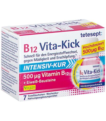 Anwendungsgebiet von Tetesept B12 Vita-Kick Intensiv-Kur 500µgTetesept B12 Vita-Kick Intensiv-Kur 500µg enthält Eiweiß-Bausteine und hochdosiertes Vitamin B12, für die Aufnahme einer hochdosierten Menge an Nährstoffen über einen kurzen Zeitraum. Vitamin B 12 trägt bei: zu einer normalen Funktion des Immunsystems zur Verringerung von Müdigkeit und Erschöpfung zu einer normalen Funktion des Nervensystems zu einem normalen Energiestoffwechsel Wirkstoffe / Inhaltsstoffe / ZutatenZutaten von Tetesept B12 Vita-Kick Intensiv-Kur 500µg: Wasser Fruktose L-Glutamin (0,6%) Säuerungsmittel: Zitronensäure-Anhydrat DL-Phosphoserin (0,4%) Nicotinamid (Niacin) Himbeeraroma Konservierungsstoffe: Kaliumsorbat, Natriumbenzoat L-Arginin Färbendes Lebensmittel: Holunderbeerkonzentrat Cyanocobalamin (Vitamin B12).GegenanzeigenBei bekannter Überempfindlichkeit gegen einzelne Inhaltsstoffe sollte Tetesept B12 Vita-Kick Intensiv-Kur 500µg nicht verzehrt werden.DosierungVerzehrempfehlung von Tetesept B12 Vita-Kick Intensiv-Kur 500µg: 1x täglich den Inhalt einer Trinkampulle verzehren. HinweiseNahrungsergänzungsmittel sind kein Ersatz für eine ausgewogene und abwechslungsreiche Ernährung und eine gesunde Lebensweise. Die angegebene empfohlene tägliche Verzehrmenge darf nicht überschritten werden. Außerhalb der Reichweite von kleinen Kindern aufbewahren. Tetesept B12 Vita-Kick Intensiv-Kur 500µg können in Ihrer Versandapotheke www.juvalis.de erworben werden. ...