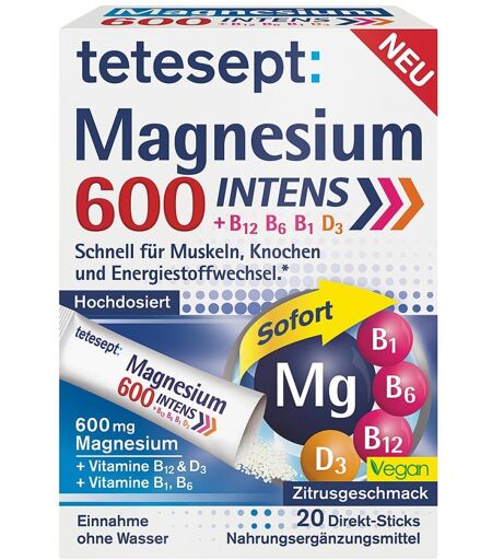 Anwendungsgebiet von Tetesept Magnesium 600 Direkt SticksTetesept Magnesium 600 Direkt Sticks ist ein Nahrungsergänzungsmittel mit Magnesium, Vitamin D und B-Vitaminen. Mit Süßungsmitteln. Magnesium – Essenzieller Begleiter für Ihr WohlbefindenMagnesium zählt zu den lebensnotwendigen Mineralstoffen, die der menschliche Körper nicht eigenständig produzieren kann. Besonders in Zeiten körperlicher oder mentaler Belastung – etwa durch Sport, Stress oder einen fordernden Alltag – kann der individuelle Magnesiumbedarf deutlich ansteigen. In solchen Momenten ist eine gezielte Versorgung besonders wichtig, um den Körper optimal zu unterstützen. Die Tetesept Magnesium 600 Direkt Sticks bieten Ihnen hochdosiertes Magnesium kombiniert mit sorgfältig ausgewählten Vitaminen – ideal dosiert in Form eines Micro-Granulats. Diese Darreichungsform ermöglicht eine besonders einfache und schnelle Einnahme – ganz ohne Wasser. Ob unterwegs, im Büro oder beim Sport: So versorgen Sie Ihren Körper unkompliziert und gezielt mit wichtigen Mikronährstoffen.Wirkstoffe / Inhaltsstoffe / ZutatenZutaten von Tetesept Magnesium 600 Direkt Sticks: Magnesiumoxid Süßungsmittel: Sorbitol Säuerungsmittel: Citronensäure Füllstoff: Mikrokristalline Cellulose Pyridoxinhydrochlorid Thiaminmononitrat Aroma: Mandarine Maltodextrin Natürliches Aroma Trennmittel: Magnesiumstearat Stabilisator: Gummi Arabicum Modifizierte Stärke Öl, pflanzlich (Kokosnuss) Antioxidationsmittel: DL-alpha-Tocopherol, Natriumascorbat Trennmittel: Tricalciumphosphat Cholecalciferol (Vitamin D3).GegenanzeigenBei bekannter Überempfindlichkeit gegenüber einem der oben genannten Inhaltsstoffe sollte das Produkt nicht angewendet werden.DosierungVerzehrempfehlung von Tetesept Magnesium 600 Direkt Sticks:1x täglich den Inhalt eines Sticks verzehren.Keine weiteren Magnesium- und Vitamin B12-haltigen Präparate verzehren.HinweiseNahrungsergänzungsmittel sind kein Ersatz für eine abwe ...