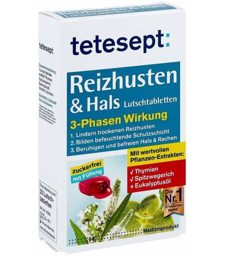 Wirkstoffe / Inhaltsstoffe / ZutatenEucalyptusölLevomentholSpitzwegerichkrautThymian3-sn-Phosphatidylcholin (Sojabohne) Hilfstoff (+)Gelatine Hilfstoff (+)Isomalt Hilfstoff (+)Maltitol Lösung Hilfstoff (+)Protein (aus Hafer) Hilfstoff (+)Protein (aus Milch) Hilfstoff (+)0.13 BE Gesamt Kohlenhydrate Hilfstoff (+) Tetesept Reizhusten & Hals Lutschtabletten können in Ihrer Versandapotheke www.juvalis.de erworben werden. ...