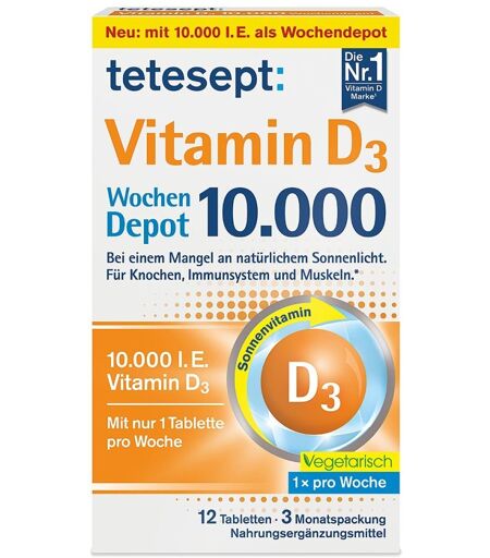 Anwendungsgebiet von Tetesept Vitamin D3 10.000 FilmtablettenTetesept Vitamin D3 10.000 Filmtabletten ist ein Nahrungsergänzungsmittel mit Vitamin D3 in Form eines Wochendepots. Es kann unterstützend eingenommen werden bei einem Mangel an natürlichem Sonnenlicht für Knochen, Immunsystem und Muskeln. Es nutzt die Fähigkeit des Körpers, Vitamin D zu speichern. Dank der Wochendosierung von 10.000 I.E. (250 µg) Vitamin D3 wird der Körper so für 7 Tage versorgt – mit nur einer Tablette pro Woche.Wirkstoffe / Inhaltsstoffe / ZutatenZutaten von Tetesept Vitamin D3 10.000 Filmtabletten:Füllstoff: Mikrokristalline Cellulose Maltodextrin Stärke Füllstoff: Hydroxypropylmethylcellulose Saccharose Trennmittel: Magnesiumsalze der Speisefettsäuren Überzugsmittel: Hydroxypropylcellulose Farbstoff: Calciumcarbonat Trennmittel: Talkum Öl, pflanzlich (Kokosnuss) Trennmittel: Speisefettsäure Cholecalciferol (Vitamin D3) Farbstoff: Eisenoxid gelb.GegenanzeigenBei bekannter Überempfindlichkeit gegenüber einem der oben genannten Inhaltsstoffe sollte das Produkt nicht angewendet werden.DosierungVerzehrsempfehlung von Tetesept Vitamin D3 10.000 Filmtabletten:1x wöchentlich 1 Tablette unzerkaut mit ausreichend Flüssigkeit verzehren. Es empfiehlt sich die Einnahme zu einer Mahlzeit.Für Erwachsene. Keine weiteren Vitamin-D-haltigen Präparate verzehren.HinweiseNahrungsergänzungsmittel sind kein Ersatz für eine abwechslungsreiche und ausgewogene Ernährung, die zusammen mit einer gesunden Lebensweise von Bedeutung ist.Die angegebene empfohlene tägliche Verzehrsmenge darf nicht überschritten werden.Für kleine Kinder unzugänglich aufbewahren. Tetesept Vitamin D3 10.000 Filmtabletten können in Ihrer Versandapotheke www.juvalis.de erworben werden. ...