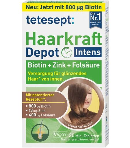 Anwendungsgebiet von Tetesept Haarkraft Depot Intens TablettenTetesept Haarkraft Depot Intens Tabletten sind ein Nahrungsergänzungsmittel mit Vitaminen und Zink. Gesunde, kräftige Haare sind wichtig für ein gepflegtes Erscheinungsbild. Eine Versorgung mit Vitaminen und Mineralstoffen ist immer sinnvoll. tetesept Haarkraft Depot Intens Tabletten tragen bei: zur Erhaltung normaler Haare dank Biotin und Zink zur Zellteilung dank Vitamin B12, Folsäure und Zink tetesept Haarkraft Depot Intens in der Depot-Tablette für eine langfristige Nährstoff-Versorgung – ideal zur Kur- Anwendung. Die patentierte Rezeptur (MTS®) enthält Transportbausteine mit körperverwandter Struktur. Sie tragen zum Nährstoff-Transport bei und führen zu einer optimalen Versorgung im Körper.Wirkstoffe / Inhaltsstoffe / ZutatenTetesept Haarkraft Depot Intens Tabletten enthält: Zutaten: Füllstoff: Mikrokristalline Cellulose, Hydroxypropylmethylcellulose Ascorbinsäure (Vitamin C) Nicotinamid (Niacin) Zinkoxid L-Argininhydrochlorid (4,1 %) Calcium-D-pantothenat (Pantothensäure) Pyridoxinhydrochlorid (Vitamin B6) Thiaminmononitrat (Vitamin B1) Überzugsmittel: Hydroxypropylcellulose Farbstoff: Calciumcarbonat Trennmittel: Magnesiumsalz der Speisefettsäuren D-Biotin Trennmittel: Talkum Pteroylmonoglutaminsäure (Folsäure) Trennmittel: Speisefettsäure Öl, pflanzlich (Kokosnuss) Farbstoff: Eisenoxid gelb Cyanocobalamin (Vitamin B12). Nährwerte: Bezeichnung Wert % der Nährstoffbezugswerte Vitamin C (VITC-) ≈ 24 mg ≈ 30 % Vitamin B 1, Thiamin (THIA) ≈ 3 mg ≈ 273 % Niacin (NIA) ≈ 16 mg NE ≈ 100 % Vitamin B 6 (VITB6-) ≈ 3,6 mg ≈ 257 % Folsäure (FOLDFE) ≈ 400 μg ≈ 200 % Vitamin B 12 (VITB12) ≈ 9 μg ≈ 360 % Biotin (BIOT) ≈ 800 μg ≈ 1600 % Pantothensäure (PANTAC) ≈ 6 mg ≈ 100 % Zink (ZN) ≈ ...