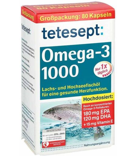 HinweiseDie empfohlene tägliche Verzehrmenge darf nicht überschritten werden. Nahrungsergänzungsmittel sind kein Ersatz für eine gesunde und ausgewogene Ernährung und sollten außerhalb der Reichweite von Kindern aufbewahrt werden. Tetesept Omega-3 1000 Kapseln können in Ihrer Versandapotheke www.juvalis.de erworben werden. ...