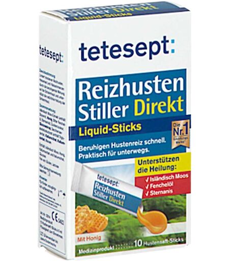 Anwendungsgebiet von Tetesept Reizhusten Stiller Direkt Liquid SticksTetesept Reizhusten Stiller Direkt Liquid Sticks lindern akuten trockenen Reizhusten sowie begleitende Halsbeschwerden und Hustenreiz schnell. Sie beruhigen die gereizten Atemwege in Hals und Rachen wirksam. Wirkstoffe / Inhaltsstoffe / Zutaten Zutaten von Tetesept Reizhusten Stiller Direkt Liquid Sticks: #IFAP#0.7 g BienenhonigFructoseGlucoseIsländisches MoosBitterfenchelöl Hilfstoff (+)Glucose Lösung Hilfstoff (+)3.4 g Glucose Hilfstoff (+)Glycerol Hilfstoff (+)Kalium citrat Hilfstoff (+)Kalium sorbat Hilfstoff (+)Saccharose acetat isobutyrat Hilfstoff (+)Sternanisöl Hilfstoff (+)Triglyceride Hilfstoff (+)Zuckercouleur Hilfstoff (+)GegenanzeigenBei bekannter Überempfindlichkeit gegen einzelne Inhaltsstoffe sollte Tetesept Reizhusten Stiller Direkt Liquid Sticks nicht verzehrt werden.DosierungAnwendungsempfehlung von Tetesept Reizhusten Stiller Direkt Liquid Sticks: Den Inhalt zur optimalen Benetzung der Mund- und Rachenschleimhaut ca. 30 Sekunden im Mund zergehen lassen und anschließend schlucken. Erwachsene nehmen 3mal täglich 2 Sticks (10ml) Jugendliche zwischen 15 und 18 Jahren nehmen bis zu 5mal täglich 1 Stick (5 ml) Jugendliche zwischen 11 und 14 Jahren nehmen bis zu 3mal täglich 1 Stick (5ml) Kinder zwischen 4 und 10 Jahren nehmen bis zu 2 mal täglich 1 Stick (5ml) Kinder zwischen 1 und 3 Jahren nehmen 1 mal täglich 1 Stick (5ml) HinweiseNahrungsergänzungsmittel sind kein Ersatz für eine ausgewogene und abwechslungsreiche Ernährung und eine gesunde Lebensweise. Die angegebene empfohlene tägliche Verzehrmenge darf nicht überschritten werden. Außerhalb der Reichweite von kleinen Kindern aufbewahren. Tetesept Reizhusten Stiller Direkt Liquid Sticks können in Ihrer Versandapotheke www.juvalis.de erworben werden. ...