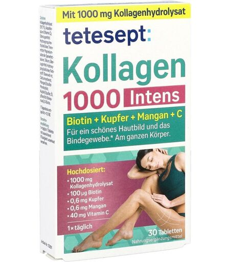 Anwendungsgebiet von Tetesept Kollagen 1000 Intens TablettenTetesept Kollagen 1000 Intens Tabletten sind ein Nahrungsergänzungsmittel mit Kollagen, Vitamin C, Biotin, Kupfer und Mangan. Kollagen ist das wichtigste Strukturprotein der Haut. Es befindet sich vor allem im Bindegewebe. Kollagen wird täglich neu gebildet, wobei die Fähigkeit der Haut zur Kollagenproduktion schon ab 30 Jahren stetig abnimmt. Eine regelmäßige Zufuhr von Vitaminen und Mineralstoffen kann helfen, die Haut von innen zu unterstützen. tetesept Kollagen 1000 Intens kombiniert 1000mg Kollagen mit essentiellen Vitaminen und Mineralstoffen für die Haut und das Bindegewebe. Dank der ausgewählten Nährstoffe trägt tetesept Kollagen 1000 Intens bei: zu einer normalen Bindegewebsbildung dank Mangan zur Erhaltung von normalem Bindegewebe dank Kupfer zu einer normalen Kollagenbildung für eine normale Funktion der Haut dank Vitamin C. Zu diesen Funktionen zählt z.B. die Hautelastizität. zum Schutz der Zellen vor oxidativem Stress dank Vitamin C, Kupfer und Mangan zur Erhaltung normaler Haut dank Biotin zu einer normalen Hautpigmentierung dank Kupfer Wirkstoffe / Inhaltsstoffe / ZutatenTetesept Kollagen 1000 Intens Tabletten enthält: Zutaten: Kollagenhydrolysat (91,7%) Ascorbinsäure (Vitamin C) Überzugsmittel: Hydroxypropylmethylcellulose Trennmittel: Magnesiumsalze der Speisefettsäuren, Talkum Überzugsmittel: Hydroxypropylcellulose Farbstoff: Eisenoxid rot, Calciumcarbonat Mangan(II)sulfat-Monohydrat Kupfer(II)sulfat Öl, pflanzlich (Kokosnuss) D-Biotin. Nährwerte: Bezeichnung Wert % der Nährstoffbezugswerte Vitamin C (VITC-) ≈ 40 mg ≈ 50 % Biotin (BIOT) ≈ 100 μg ≈ 200 % Kupfer (CU) ≈ 0,6000 mg ≈ 60 % Mangan (MN) ≈ 0,6000 mg ≈ 30 % Kollagenhydrolysat 1000 mg **GegenanzeigenBei bekannter Überempfindlichkeit gegenüber einem der oben genannte ...