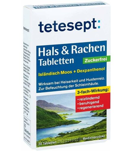 Anwendungsgebiet von Tetesept Hals & Rachen Tabletten zuckerfreiTetesept Hals & Rachen Tabletten zuckerfrei wirken bei Halsschmerzen, Heiserkeit und Hustenreiz mit der natürlichen Pflanzenkraft von Isländisch Moos und Dexpanthenol. Wirkstoffe / Inhaltsstoffe / Zutaten Zutaten von Tetesept Hals & Rachen Tabletten zuckerfrei: #IFAP#DexpanthenolIsländisches Moos TrockenextraktSorbitol Hilfstoff (+)0.1 BE Gesamt Kohlenhydrate Hilfstoff (+)Pfefferminz Aroma Hilfstoff (+)GegenanzeigenBei bekannter Überempfindlichkeit gegen einzelne Inhaltsstoffe sollte Tetesept Hals & Rachen Tabletten zuckerfrei nicht verzehrt werden.DosierungVerzehrempfehlung von Tetesept Hals & Rachen Tabletten zuckerfrei: Erwachsene und Kinder ab 6 Jahren lassen 3–6-mal täglich 1 Tablette im Mund zergehen.HinweiseNahrungsergänzungsmittel sind kein Ersatz für eine ausgewogene und abwechslungsreiche Ernährung und eine gesunde Lebensweise. Die angegebene empfohlene tägliche Verzehrmenge darf nicht überschritten werden. Außerhalb der Reichweite von kleinen Kindern aufbewahren. Tetesept Hals & Rachen Tabletten zuckerfrei können in Ihrer Versandapotheke www.juvalis.de erworben werden. ...