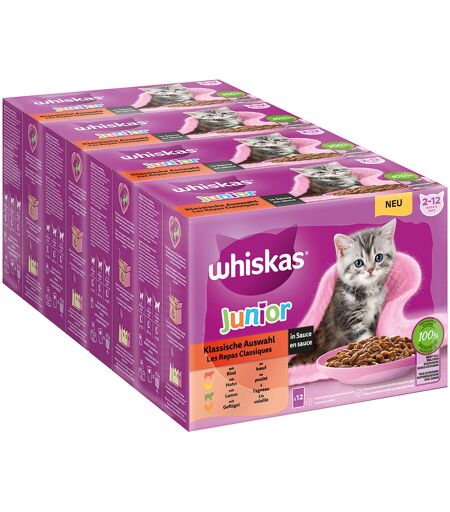 48x 85g Megapack Whiskas Junior Frischebeutel Klassische Auswahl in Sauce Katzenfutter nass