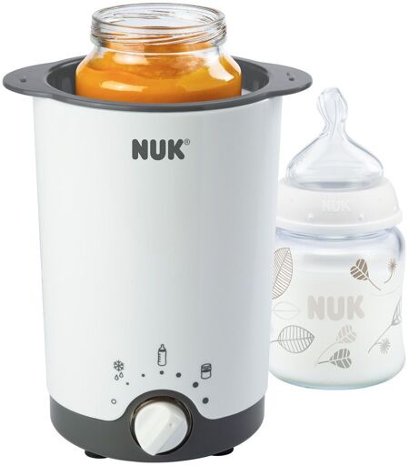 Erwärmt Babynahrung gleichmäßig und sanft im WasserbadTaut Babykost schonend und sicher aufHält Babyfläschchen und Gläser nach Erreichen der gewünschten Temperatur automatisch warmEinfache und sichere Bedienung durch einen DrehknopfKlein, kompakt und platzsparend – und leicht zu reinigen NUK Thermo 3in1 Flaschenwärmer, zum einfachen, sicheren und schonenden Erwärmen, Auftauen und Warmhalten, für handelsübliche Gläschen und FlaschenWarum ein Flaschenwärmer?Ein Flaschenwärmer erleichtert vielen Eltern bereits direkt nach der Geburt ihres Kindes das Leben.Bekommt das Baby die Flasche, sollte man auf den Flaschenwärmer nicht verzichten: Prüfende Blicke auf das Thermometer und die Abkühlung der zu heißen Flasche unter kaltem Wasser gehören so der Vergangenheit an.Mithilfe des sanften Aufheizprozesses im Wasserbad erwärmt der NUK Thermo 3in1 Flaschenwärmer die Babynahrung schonend und gleichmäßig auf die gewünschte Temperatur.Mit der automatischen Warmhaltefunktion kann diese dann warm- und zum Verzehr bereitgehalten werden.Der Flaschenwärmer ist auch für das einfache und schonende Erwärmen von abgepumpter Muttermilch geeignet.Wie bedient man den Flaschenwärmer?Die Handhabung des NUK Thermo 3in1 ist denkbar einfach: Ob die Babykost Zimmertemperatur hat oder tiefgekühlt ist – zunächst wird die Flasche oder das Gläschen unverschlossen mithilfe des Korbes in den Flaschenwärmer gestellt und der Hohlraum mit Wasser aufgefüllt.Über den Drehknopf wird ganz einfach die gewünschte Einstellung ausgewählt und so die Milch oder der Brei erwärmt oder aufgetaut.Nach Erreichen der gewünschten Temperatur geht das Gerät automatisch in die Warmhaltestellung über.Ein besonderer Vorteil des NUK Thermo 3in1: Beim Auftauen wird die Nahrung schonend erwärmt, sodass wichtige Vitamine und Nährstoffe erhalten bleiben.Leichte ReinigungDer separate Korb fungiert als Gläschenhalter, mit dem Babyfläschchen und Breigläser einfach in den platzsparenden und leichten NUK Thermo 3in1 hineingestellt und wieder herausgenommen werden können.Damit ist das Reinigen des Flaschenwärmers im Handumdrehen erledigt. Hinweise:Geeignet für flüssige und breiförmige Nahrung in handelsüblichen Gläschen und FlaschenFür Flaschen aus PE und Muttermilchbeutel ist das Gerät nicht geeignet.Technische Daten: 220-240 Volt, 100 Watt.Der NUK Thermo 3in1 Flaschenwärmer sollte in regelmäßigen Abständen entkalkt werden, um die Funktionsfähigkeit des Gerätes sicherzustellen.nd leicht zu reinigen ...
