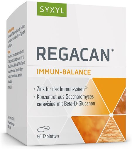 Nahrungsergänzungsmittel sind kein Ersatz für eine ausgewogene und abwechslungsreiche Ernährung und eine gesunde Lebensweise.Körpereigene Abwehr aufrechterhalten. Unser Immunsystem hat niemals Pause, überall und jederzeit ist es aktiv und kämpft in unserem Innersten um unsere Gesundheit. Die meiste Zeit geschieht dies für uns nicht wahrnehmbar und manchmal dann doch spürbar, wenn uns ein Infekt zur Bettruhe zwingt. Neben den üblichen Verdächtigen wie Viren und Bakterien, hat unser Immunsystem auch mit negativen Umwelteinflüssen wie Feinstaub und erhöhten UV-Strahlungen zu kämpfen. Um den Belastungen etwas entgegen halten zu können, können wir unser Immunsystem unterstützen. Regacan ist ein Nahrungsergänzungsmittel mit Zink für das Immunsystem sowie Beta-D-Glucanen. Der ursprünglich aus Japan und China stammende Maitake-Pilz rundet die Formulierung von Regacan ab. Seine Fundstellen wurden früher streng geheim gehalten, da man ihn wertvoller als Gold einschätzte. Erst in der Neuzeit ist es gelungen, den Maitake-Pilz zu kultivieren und einen ausreichenden Bestand zu sichern.Anwendung: Täglich entweder 3 Tabletten gleichzeitig (idealerweise abends) oder 3-mal über den Tag verteilt je 1 Tablette mit etwas Flüssigkeit einnehmen. Vegan, gelatinefrei, glutenfrei, laktosefrei, farb-und konservierungsstofffrei lt. GesetzZutaten:Konzentrat aus Saccharimyces cerevisiae mit ß-D-Glucanen (56,5%), Maitakepulver, Füllstoff Cellulose, Zinkgluconat, Füllstoff Natriumcarboxymethylcellulose, Trennmittel Magnesiumsalze der Speisefettsäuren, Trennmittel Siliciumoxid. Nährwerte: Durchschnittliche Nährwerte: 3 Tabletten je 100 g Zink 5 mg 0,27 g Konzentrat aus Saccharomyces cerevisiae 1,05 g 56,5 g Maitakepulver 450 mg 24,2 g Verzehrsempfehlung:Pro Tag 3 Regacan-Tabletten – am besten abends – einnehmen oder 3-mal täglich jeweils 1 Tablette.Hinweis:Die angegebene empfohlene Tagesmenge darf nicht überschritten werden. Aufbewahrung: Kühl (6-25 °C) und lichtgeschützt lagern. Außerhalb der Reichweite von kleinen Kindern aufbewahren.Nettofüllmenge: 90 Tabletten à 620 mg = 55,8 g Herstellerdaten: Syxyl GmbH & Co. KG Gereonsmühlengasse 5 50670 Köln ...