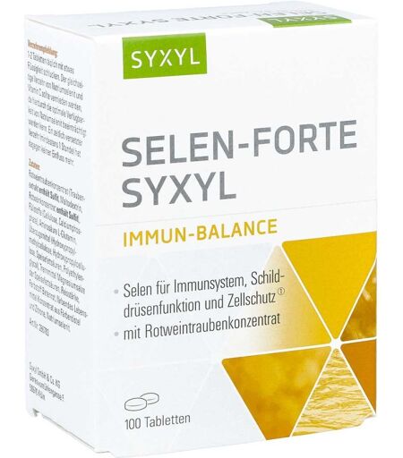 Anwendungsgebiet von Selen Forte Syxyl TablettenSelen Forte Syxyl Tabletten ist ein Nahrungsergänzungsmittel mit Selen, der Aminosäure L-Glutamin und Rotweintraubenkonzentrat. Selen ist für den Menschen ein lebenswichtiges Spurenelement. In vielen Enzymen ist Selen in Form von Selenproteinen enthalten und wird für viele verschiedene Reaktionen im Körper benötigt. Selen kann dazu beitragen, die Zellen im Körper vor oxidativem Stress zu schützen. Wiederum andere von Selen abhängige Enzyme regulieren unter anderem den Haushalt der Schilddrüsenhormone und tragen somit zu einer normalen Funktion der Schilddrüse bei. Auch für die Erhaltung normaler Haare und Nägel wird Selen benötigt. Bei einer Unterversorgung profitieren also auch Haare und Nägel von der Einnahme dieses wichtigen Spurenelements. Wirkstoffe / Inhaltsstoffe / ZutatenZutaten von Selen Forte Syxyl Tabletten: Rotweintraubenkonzentrat (Traubenextrakt enthält Sulfit, Maltodextrin, Rotweinkonzentrat enthält Sulfit), Füllstoffe (Cellulose, Calciumphosphate), Aminosäure L-Glutamin, Überzugsmittel (Hydropropylmethylcellulose, Hydroxypropylcellulose, Speisefettsäuren, Polyethylenglycol), Trennmittel Magnesiumsalze der Speisefettsäuren, Reisstärke, Farbstoff Betenrot, färbendes Lebensmittel Konzentrat aus Färberdistel und Zitrone, Natriumselenit. Durchschnittliche Nährwerte pro Tagesportion: 1 Tablette 2 Tabletten: Selen: 100 µg (182%*) 200 µg (364%*) L-Glutamin: 100 mg 200 mg Rotweintraubenkonzentrat: 200 mg 400 mg * NRV (Nährstoffbezugswerte) für Erwachsene nach der Lebensmittel-InformationsverordnungGegenanzeigenBei bekannter Überempfindlichkeit gegenüber einem der oben genannten Inhaltsstoffe sollte das Produkt nicht verwendet werden. DosierungVerzehrsempfehlung von Selen Forte Syxyl Tabletten: Nehmen Sie 1 bis 2 Tabletten täglich mit etwas Flüssigkeit ein. Der gleichzeitige Verzehr von Natr ...