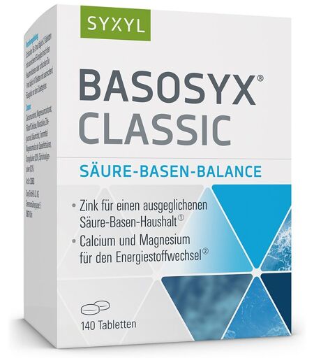 Nahrungsergänzungsmittel sind kein Ersatz für eine ausgewogene, abwechslungsreiche Ernährung und eine gesunde Lebensweise.Lebenslust ohne Säurefrust Das Leben ist viel zu kurz, um es nicht zu genießen: Feiern, Reisen, leckeres Essen und feucht-fröhliche Abende mit Freunden sind die Würze des Lebens – aber sie verlangen dem Körper auf Dauer einiges ab! Denn wenn der Organismus übersäuert, gerät der Stoffwechsel ins Stocken – und darunter leidet die geistige und körperliche Belastbarkeit. Unterstütze Deinen Körper und tue ihm etwas Gutes: Säure-Basen-Ausgleich* Regeneration* Energie* Basosyx® ClassicNahrungsergänzungsmittel mit basischen Mineralstoffverbindungen und Zink für den Säure-Basen-Haushalt.Basosyx® Classic enthält Zink, das Deinen Körper dabei unterstützt, den Säure-Basen-Haushalt im natürlichen Gleichgewicht zu halten: Basische, natriumfreie Mineralstoffverbindungen binden die Säure effektiv und schonend. Zink trägt zu einem normalen Säure- Basen-Stoffwechsel bei. Calcium und Magnesium unterstützen den Energiestoffwechsel. Mit den zusätzlichen Naturstoffen Spargel- und Spirulinaalgenpulver. *Säure-Basen-Ausgleich: Zink trägt zu einem normalen Säure-Basen-Stoffwechsel bei. Regeneration: Calcium, Magnesium und Zink haben eine Funktion bei der Zellteilung. Zink unterstützt zudem die DNA-Synthese. Magnesium trägt zum Elektrolytgleichgewicht und zur Verringerung von Müdigkeit und Erschöpfung bei. Energie: Calcium und Magnesium unterstützen den Energiestoffwechsel. Wie auch Kalium unterstützt Magnesium die normale Funktion des Nervensystems. Zink unterstützt die allgemeine geistige Leistungsfähigkeit. Vegan, gelatinefrei, glutenfrei, hefefrei, laktosefrei, farbstofffrei und konservierungsstofffrei lt. Gesetz., natriumfreie Mineralstoffverbindungen. Nahrungsergänzungsmittel sind kein Ersatz für eine ausgewogene, abwechslungsreiche Ernährung und eine gesunde Lebensweise. Nahrungsergänzungsmittel mit Mineralstoffen, Algenpulver und Spargelpulver. Zutaten:Calciumcarbonat, Magnesiumcarbonat, Füllstoff Cellulose, Maisstärke, Zinkgluconat, Kaliumcitrat, Trennmittel Magnesiumsalze der Speisefettsäuren, Spargelpulver (0,3 %), Spirulinaalgenpulver (0,3 %). Nährwerte:Durchschnittliche Zusammensetzung je Tagesportion4 Tabletten6 TablettenNRV* 4/6 TablettenCalcium644 mg966 mg81 % / 121 %Magnesium211 mg316 mg56 % / 84 %Zink10 mg15 mg100 % /150 %* NRV (Nährstoffbezugswerte) für Erwachsene nach der Lebensmittel-InformationsverordnungVerzehrempfehlung:Schlucken Sie 3-mal täglich 2 Tabletten mit ausreichend Flüssigkeit nach den Hauptmahlzeiten oder schlucken Sie 1-mal täglich 4 Tabletten mit ausreichend Flüssigkeit vor dem Zubettgehen.Hinweis:Die angegebene empfohlene Tagesmenge darf nicht überschritten werden.Aufbewahrung: Kühl (6-25 °C) und lichtgeschützt lagern. Außerhalb der Reichweite von kleinen Kindern aufbewahren.Nettofüllmenge:140 Tabletten = 98 gHersteller:Syxyl GmbH & Co. KGGereonsmühlengasse 550670 Köln ...
