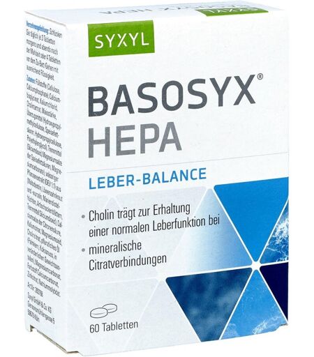Anwendungsgebiet von Basosyx Hepa Syxyl TablettenBasosyx Hepa Syxyl Tabletten ist ein Nahrungsergänzungsmittel mit Zink für den Säure-Basen-Haushalt und Cholin zur Erhaltung einer normalen Leberfunktion.Wirkstoffe / Inhaltsstoffe / ZutatenZutaten von Basosyx Hepa Syxyl Tabletten: Füllstoffe (Cellulose, Calciumphosphate), Calciumbisglycinat, Kaliumchlorid, Cholintartrat, Maisstärke, Überzugsmittel (Hydroxypropylmethylcellulose, Speisefettsäuren, Hydroxypropylcellulose, Polyethylenglycol), Trennmittel (Siliciumdioxid, Magnesiumsalze der Speisefettsäuren, Magnesiumcarbonate), wässriger Pflanzenextrakt (DEV 1:1) aus (Maltodextrin, Löwenzahnkraut und -wurzeln, Mariendistelfrüchten, Artischockenblättern, Trennmittel Siliciumdioxid), Calciumsalze der Citronensäure, Kaliumcitrat, Magnesiumoxid, Cholincitrat, pflanzliches Öl (Palmkern, Kokosnuss, in veränderlichen Gewichtsanteilen), Magnesiumcarbonat, Farbstoff Calciumcarbonat, Zinkcitrat, Natriummolybdat. Nährwerttabelle: Durchschnittliche Zusammensetzung je Tagesportion: 4 6 Tabletten Mineralstoffe: Kalium: 200 mg 300 mg (10%* 15%*) Calcium: 80 mg 120 mg (10%* 15%*) Magnesium: 40 mg 60 mg (11%* 16%*) Zink: 3,3 mg 5 mg (33%* 50%*) Molybdän: 17 µg 25 µg (33%* 50%*) Pflanzliche Zutaten: Wässriger Pflanzenextrakt (DEV 1:1) aus Artischocke, Löwenzahn und Mariendistel: 133mg 200 mg Weitere Zutaten: Cholin: 133 mg 200 mg NRV (Nährstoffbezugswerte) für Erwachsene nach er Lebensmittel-InformationsverordnungGegenanzeigenBei bekannter Überempfindlichkeit gegen einen der Inhaltsstoffe sollte dieses Produkt nicht angewendet werden.DosierungVerzehrsempfehlung von Basosyx Hepa Syxyl Tabletten: Schlucken Sie täglich je 3 Tabletten morgens und abends nach der Mahlzeit oder 4 Tabletten vor dem Schlafengehen mit ausreichend Flüssigkeit.HinweiseNahrungsergänzungsmittel sind kein Ersatz für eine ausgewogene un ...
