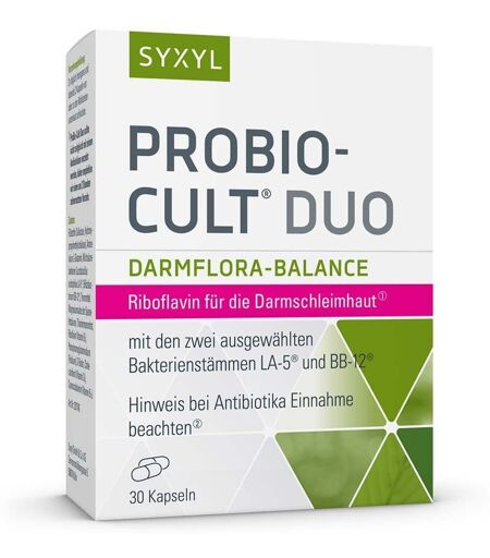 Nahrungsergänzungsmittel sind kein Ersatz für eine abwechslungsreiche und ausgewogene Ernährung und eine gesunde Lebensweise. SYXYL PROBIO-CULT® DUO zur täglichen Darmpflege Nahrungsergänzungsmittel sind kein Ersatz für eine abwechslungsreiche und ausgewogene Ernährung und eine gesunde Lebensweise. SYXYL ProBio-Cult® DuoSet bestehend aus: 2x SYXYL ProBio-Cult® Duo Der Darm – Mittelpunkt unserer Gesundheit! Unser Darm ist das größte Organ des Körpers und mit allen Bereichen unseres Organismus vernetzt. Damit beeinflusst es mutmaßlich nicht nur unsere Verdauung, sondern auch das Immunsystem bis hin zur Psyche.ProBio-Cult® Duo Die Forschung hat einige Systeme dieses Kosmos entschlüsseln können. Den menschlichen Darm besiedeln schätzungsweise 100 Billionen kleine Mikroorganismen (Bakterien). Die Gesamtheit der Bakterien wird auch als Darmflora bzw. Mikrobiota bezeichnet. Milchsäurebakterien sind ein wesentlicher Teil der natürlichen Darmflora. Sie besiedeln normalerweise bis zu 80% des Dünn- und Dickdarms- Da die Darmflora empfindlich ist, kann sich die Zusammensetzung der Milchsäurebakterien leicht verändern. Äußere Faktoren, wie z.B. Ernährung, Lebensstil (etwa Stress und mangelnde Bewegung) oder Medikamente können einen Einfluss darauf haben. In ProBio-Cult® Duo sind die besonderen Bakterienstämme Lactobacillus acidophilus (LA-5® Lactobacillus acidophilus) und Bifidobacterium lactis (BB-12® Bifidobacterium) enthalten. Aufgrund des besonderen Herstellungsverfahrens von ProBio-Cult® Duo ist gewährleistet, dass LA-5® und BB-12® die Magenpassage unbeschadet passieren und sich im gesamten Darm ausbreiten können. BB-12® gilt als sehr gut dokumentiertes Bifidobakterium. Darüber hinaus sind beide Stämme genstabil. Mit 4 Kapseln ProBio-Cult® Duo nehmen Sie 2,3 x 1010 (23 Milliarden Lebendkulturen) an Milchsäurebakterien zu sich. Welche weiteren Inhaltsstoffe sind in ProBio-Cult® Duo enthalten? Neben wasserlöslichen Vitaminen des B-Komplexes ist zusätzlich das fettlösliche Vitamin D3 (Cholecalciferol) enthalten. Vitamin D trägt zu einer normalen Aufnahme/Verwertung von Calcium und Phosphor und zu einer normalen Funktion des Immunsystems bei. Achten Sie dabei auf eine magensaftresistente Darreichungsform wie bei ProBio-Cult® Duo, damit die Milchsäurebakterien nicht durch die Magensäure zerstört werden, sondern auch im Darm ankommen und dort ihre Wirkung entfalten können! Folsäure und Vitamin B12 unterstützen die Zellteilung und damit auch diejenige der Darmzellen und tragen zu einer normalen Funktion des Immunsystems bei. Vitamin B2 (Riboflavin) trägt zur normalen Funktion der Schleimhäute bei, damit auch der Darmschleimhaut.ProBio-Cult® Duo zeichnet sich zudem durch den Gehalt der konditionell-essentiellen Aminosäure L-Glutamin aus.Magensaftresistent.Gelatinefrei, Glutenfrei, Hefefrei, Laktosefrei. FarbstofffreiZutaten: Füllstoffe (Cellulose, Hydroxypropylmethylcellulose), Aminosäure L-Glutamin, Milchsäurebakterien (Lactobacillus acidophilus LA-5 ®,... ...