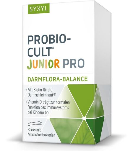 Anwendungsgebiet von Probio-Cult Junior Pro Syxyl BeutelProbio-Cult Junior Pro Syxyl Beutel ist ein Nahrungsergänzungsmittel mit Vitaminen und Milchsäurebakterien. Mit vier ausgewählten Milchsäurebakterienstämmen Vitamin D unterstützt die normale Funktion des Immunsystems bei Kindern Für die ganze Familie Biotin trägt zur Erhaltung normaler Schleimhäute bei also auch der Darmschleimhaut Geeignet für die ganze Familie Die Mischung besteht aus Bifidobacterium breve BR03, Bifidobacterium infantis BI02, Lactobacillus reuteri LRE02, Lactobacillus salivarius sub. salivarius LS03. Wirkungsweise von Probio-Cult Junior Pro Syxyl BeutelDie ausgewählten Milchsäurebakterien in ProBio-Cult® Junior Pro sind aufgrund ihres besonderen Herstellungsverfahrens säurestabil und können, im Gegensatz zu mit der Nahrung aufgenommenen Bakterien, die Passage durch Magen und Magensäure unbeschadet überstehen.Wirkstoffe / Inhaltsstoffe / ZutatenProbio-Cult Junior Pro Syxyl Beutel enthält: Glukose, Inulin, Maltodextrin, Maisstärke, Milchsäurebakterien (Bifidobacterium breve BR03, Bifidobacterium infantis BI02, Lactobacillus reuteri LRE02, Lactobacillus salivarius sub. salivarius LS03), Trennmittel Magnesiumsalze der Speisefettsäuren, D-Biotin, Cholecalciferol (Vitamin D3), Cyanocobalamin (Vitamin B12). Durchschnittliche Nährwerte pro 1 Stick 2 Sticks NRV* 1/2 Sticks Vitamin D 5,0 µg 10 µg 100 % /200 % Vitamin B12 2,5 µg 5,0 µg 100 %/200 % Biotin50 µg 100 µg 100 % /200 % * NRV (Nährstoffbezugswerte) für Erwachsene nach der Lebensmittel-Informationsverordnung ** keine Nährstoffbezugswerte vorhanden Mischung aus Bifidobacterium breve BR03, Bifidobacterium infantis BI02, Lactobacillus reuteri LRE02, Lactobacillus salivarius sub. salivarius LS03. 1 Stick: 1 Milliarde Milchsäurebakterien 2 Sticks: 2 Milliarden Milchsäurebakterien Dos ...