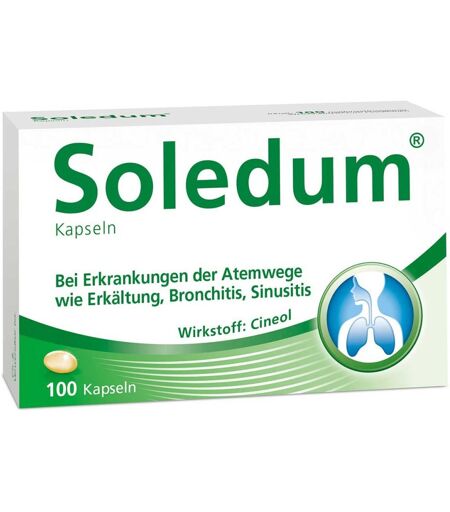 Anwendungsgebiet von Soledum 100mgSoledum 100mg dienen der Behandlung chronischer, akuter oder entzündlicher Erkrankungen der Atemwege. Außerdem kann Soledum 100mg bei grippalen Infekten, Erkältungserkrankungen mit Husten und Schnupfen, akuter und chronische Bronchitis sowie Nebenhöhlenentzündungen angewendet werden. Wirkungsweise von Soledum 100mgSoledum 100mg sind rein pflanzlich und enthalten den Wirkstoff Cineol in reiner Form. Dieser Naturstoff wird aus den Blättern des Eucalyptusbaums gewonnen. Im Körper gelangt er über die Blutbahn in die Atemwege, wo er seine schleimlösende, entzündungshemmende und krampflösende Wirkung entfalten kann. Soledum 100mg helfen, entzündliche Sekrete und zähen Schleim in den Atemwegen zu verflüssigen und so ihren Abtransport zu erleichtern. Da ein Sekretstau verhindert wird, wird auch dem Festsetzen der Erreger und ihrer weiteren Ausbreitung in den Atemwegen vorgebeugt. Durch die geringe Größe der Soledum 100mg wird ein angenehmes Einnehmen begünstigt.Wirkstoffe / Inhaltsstoffe / ZutatenEine magensaftresistente Kapsel von Soledum 100mg enthält: 100 mg Cineol Hilfsstoffe: Mittelkettige Triglyceride D-Glucitol-D-Mannitol-Oligosaccharide Gelatine Glycerol 85% Salzsäure 25% Methacrylsäure-Ethylacrylat-Copolymer Propylenglycol Polysorbat 80 Glycerolmonostearat 40-55GegenanzeigenBei bekannter Überempfindlichkeit gegen den Wirkstoff Cineol oder gegen einen der weiteren Bestandteile darf das Arzneimittel nicht eingenommen werden. Auch bei Keuchhusten und Krupp sollte es nicht angewendet werden.DosierungAnwendungsempfehlung von Soledum 100mg: Erwachsene und Kinder über 10 Jahre: nehmen 3 x täglich 2 Kapseln ein. In besonders hartnäckigen Fällen 4 x tgl. 2 Kapseln. Zur Weiter- bzw. Dauerbehandlung reichen im Allgemeinen 2 x tgl. 2 Kapseln aus. Kinder unter 10 Jahren: 3 x tgl. 1 Kapsel. Nehmen Sie die Kapseln unzerkaut mit reichlich nicht zu heißer Flüssigkei ...