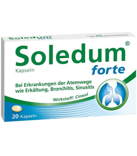 Anwendungsgebiet von Soledum Kapseln forte 200mgSoledum Kapseln forte 200mg werden bei akuten, chronischen und entzündlichen Erkrankungen der Atemwege sowie bei grippalen Infekten, Erkältungskrankheiten mit Husten und Schnupfen, akuter und chronischer Bronchitis sowie bei Nasennebenhöhlenentzündungen (Sinusitis) angewendet. Wirkungsweise von Soledum Kapseln forte 200mgSoledum Kapseln forte 200mg sind rein pflanzlich und enthalten den Wirkstoff Cineol. Dieser Naturstoff wird aus den Blättern des Eukalyptusbaums gewonnen. Im Körper gelangt er über die Blutbahn in die Atemwege, wo er seine schleimlösende, entzündungshemmende und krampflösende Wirkung entfalten kann. Soledum Kapseln forte 200mg helfen, entzündliche Sekrete und zähen Schleim in den Atemwegen zu verflüssigen und so ihren Abtransport zu erleichtern. Da ein Sekretstau verhindert wird, wird auch dem Festsetzen der Erreger und ihrer weiteren Ausbreitung in den Atemwegen vorgebeugt. Wirkstoffe / Inhaltsstoffe / ZutatenEine magensaftresistente Kapsel der Soledum Kapseln forte 200mg enthält: 200 mg Cineol Hilfsstoffe: mittelkettige Triglyceride Glycerol 85% Sorbitol-Lösung 70% Methyacrysäure-Ethylacrylat-Copolymer Propylenglycol, Polysorbat 80 Glycerolmonostearat 40-55%GegenanzeigenBei bekannter Überempfindlichkeit gegen den Wirkstoff Cineol oder einen der sonstigen Bestandteile darf das Arzneimittel nicht eingenommen werden. Es sollte ebenfalls nicht angewendet werden bei Keuchhusten und Pseudokrupp sowie bei Kindern unter 12 Jahren. Eine Anwendung während der Schwangerschaft und Stillzeit sollte nicht erfolgen. Bei einer ausgeprägten Überempfindlichkeit der Atemwege sollte das Produkt nur mit besonderer Vorsicht angewendet, bei Asthma bronchiale darf das Präparat nur unter ärztlicher Kontrolle eingenommen werden.DosierungAnwendungsempfehlung von Soledum Kapseln forte 200mg: Erwachsene und Kinder über 12 Jahren nehmen 3x täglich 1 Ka ...