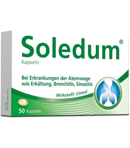 Anwendungsgebiet von Soledum 100mgSoledum 100mg dienen der Behandlung chronischer, akuter oder entzündlicher Erkrankungen der Atemwege. Außerdem kann Soledum 100mg bei grippalen Infekten, Erkältungserkrankungen mit Husten und Schnupfen, akuter und chronische Bronchitis sowie Nebenhöhlenentzündungen angewendet werden. Wirkungsweise von Soledum 100mgSoledum 100mg sind rein pflanzlich und enthalten den Wirkstoff Cineol in reiner Form. Dieser Naturstoff wird aus den Blättern des Eucalyptusbaums gewonnen. Im Körper gelangt er über die Blutbahn in die Atemwege, wo er seine schleimlösende, entzündungshemmende und krampflösende Wirkung entfalten kann. Soledum 100mg helfen, entzündliche Sekrete und zähen Schleim in den Atemwegen zu verflüssigen und so ihren Abtransport zu erleichtern. Da ein Sekretstau verhindert wird, wird auch dem Festsetzen der Erreger und ihrer weiteren Ausbreitung in den Atemwegen vorgebeugt. Durch die geringe Größe der Soledum 100mg wird ein angenehmes Einnehmen begünstigt.Wirkstoffe / Inhaltsstoffe / ZutatenEine magensaftresistente Kapsel von Soledum 100mg enthält: 100 mg Cineol Hilfsstoffe: Mittelkettige Triglyceride D-Glucitol-D-Mannitol-Oligosaccharide Gelatine Glycerol 85% Salzsäure 25% Methacrylsäure-Ethylacrylat-Copolymer Propylenglycol Polysorbat 80 Glycerolmonostearat 40-55GegenanzeigenBei bekannter Überempfindlichkeit gegen den Wirkstoff Cineol oder gegen einen der weiteren Bestandteile darf das Arzneimittel nicht eingenommen werden. DosierungAnwendungsempfehlung von Soledum 100mg: Erwachsene und Kinder über 10 Jahre: nehmen 3 x täglich 2 Kapseln ein. In besonders hartnäckigen Fällen 4 x tgl. 2 Kapseln. Zur Weiter- bzw. Dauerbehandlung reichen im Allgemeinen 2 x tgl. 2 Kapseln aus. Kinder unter 10 Jahren: 3 x tgl. 1 Kapsel. Nehmen Sie die Kapseln unzerkaut mit reichlich nicht zu heißer Flüssigkeit möglichst eine halbe Stunde vor dem Essen ein. Wenn Sie einen ...