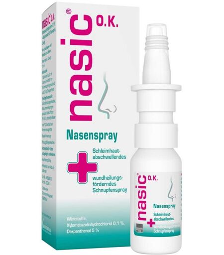 Anwendungsgebiet von Nasic O.K. - NasensprayDas bewährte WirkPlus aus Xylometazolin und Dexpanthenol befreit schnell die Nase und fördert die Heilung der geschädigten Nasenschleimhaut. nasic® O.K. ist dabei frei von Konservierungsstoffen. Bei einem Schnupfen ist die erschwerte Nasenatmung nicht das Einzige, das uns quält: häufig ist die Nase auch wund, gereizt und schmerzt. nasic® O.K. Nasenspray bekämpft die Schnupfen-Symptome mit der Wirkstoffkombination aus Xylometazolin und Dexpanthenol. Es lässt die Nasenschleimhaut abschwellen, sodass Sie wieder frei durch die Nase atmen können. Gleichzeitig pflegt es die Nase und fördert die Heilung der Schleimhäute – ganz ohne Konservierungsstoffe. Das nasic® O.K. Nasenspray ist für Erwachsene und Kinder ab 6 Jahren geeignet und kann nach dem Öffnen bis zu 6 Monate verwendet werdenWirkungsweise von Nasic O.K. - NasensprayZwei Wirkstoffe, zweifach wirksam Xylometazolin verengt die Gefäße der Schleimhaut und kann so für eine Abschwellung sorgen. Dexpanthenol pflegt und unterstützt zusätzlich die Heilung der Nasenschleimhaut, die durch Schnäuzen und Austrocknung in Mitleidenschaft gezogen wird. In nasic® O.K. Nasenspray ergänzen sich die Wirkstoffe und sind zusammen stärker als allein – so können Sie Ihren Schnupfen schneller loswerden, ganz ohne Konservierungsstoffe! Schnupfen – ein ungebetener Gast Auslöser eines Schnupfens sind meist sogenannte Rhinoviren, die in kalten Temperaturen aufblühen. Denn bei Kälte sinkt die Durchblutung der Nasenschleimhaut und damit ihre Abwehrkraft gegen Krankheitserreger. So haben die Viren leichtes Spiel und können sich rasant vermehren. Gelangen die Viren in die Nase, schaltet der Körper sofort auf Abwehr und beginnt vermehrt Schleim zu produzieren. Durch die erhöhte Durchblutung schwellen die Schleimhäute an. Die Nase verstopft – die lästigen Symptome wie Niesattacken und die ständig laufende Nase ...
