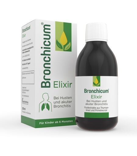Bronchicum® Elixir. Reduziert signifikant die Hustenattacken. Mit wertvoller Rezeptur aus ätherischem Öl des Thymians und Wirkstoffen aus der Primelwurzel Wirkt schleimlösend und beruhigt so die gereizten Bronchien Sehr gut verträglich Wohlschmeckend*** Für Kinder ab 6 Monaten geeignet laktosefrei, glutenfrei, vegan Zeit ist zu wertvoll, um sie mit Husten zu vergeuden. Teils schmerzhaft und anstrengend, nimmt er die Energie für das, was wirklich zählt. Doch das muss nicht sein, dank Bronchicum®. Naturstark bei Husten und akuter Bronchitis: Ein pflanzlicher Hustenlöser für die ganze Familie. Bronchicum® Elixir lindert entzündungsbedingte Bronchitis-Symptome und erleichtert das Abhusten. Bronchicum® Elixir kann bereits ab dem 6. Monat angewendet werden. Thymian & Primel bei Husten und akuter Bronchitis Thymian findet als traditionell angewandtes Heilkraut vor allem Anwendung bei Erkältungen mit Husten bzw. Bronchitis. Die ätherischen Öle des Thymians wirken schleimlösend, antibakteriell und krampflösend. So lindert er die typischen Symptome von Husten und Bronchitis und erleichtert das notwendige Abhusten. Auch die in der Primelwurzel enthaltenen Saponine wirken schleimlösend und fördern das Abhusten. Die Arzneipflanzen Thymiankraut und Primelwurzel in Bronchicum® Elixir ergänzen sich sinnvoll und wirken synergistisch. Husten – strapazierend, aber notwendig! Jeder kennt ihn und alle sind froh, wenn sie von ihm verschont bleiben – Husten. Dabei ist Husten eine natürliche Schutzfunktion des Körpers. Atmen wir Fremdstoffe ein, befördert der Körper diese mittels Hustenreiz aus den Luftwegen, damit wir weiter frei atmen können. Ausgelöst wird dieser Reiz über die Hustenrezeptoren in den Bronchialschleimhäuten. Gerade im Rahmen einer Erkältung tritt der Husten deshalb oft als Begleiterscheinung auf: Der Erkältungs-Erreger führt in den oberen Atemwegen zu einer laufenden Nase und Halsschmerzen und breitet sich dann in die unteren Atemwege aus. Erreicht er die Bronchien, also die Verästelungen, durch die die Atemluft bis zu den Lungenbläschen transportiert wird, wehrt sich das Immunsystem. Die Folge: Die Schleimhäute entzünden sich, man hustet. Bronchicum® Elixir löst den Schleim und beruhigt so die gereizten Bronchien. Bereits seit über 75 Jahren ist mit Bronchicum® ein pflanzliches Hustenmittel erhältlich. Bronchicum® ist aus den Hausapotheken nicht mehr wegzudenken und zählt zu den bewährten Arzneimitteln bei Husten und akuter Bronchitis. Das Produktportfolio umfasst fünf verschiedene Darreichungsformen des pflanzlichen Präparats, sodass jeder Verwender das für ihn passende Produkt findet: Für Erwachsene eignen sich die schnell wirksamen*, hochkonzentrierten** Bronchicum® Tropfen. Das wohlschmeckende*** Bronchicum® Elixir ist bereits für Kinder ab 6 Monaten zugelassen. In beiden Produkten ist die Arzneipflanzenkombination aus Thymian und Primel enthalten. Wer ein reines Thymian-Präparat bevorzugt, kann auf den Bronchicum® Thymian Hustensaft... ...
