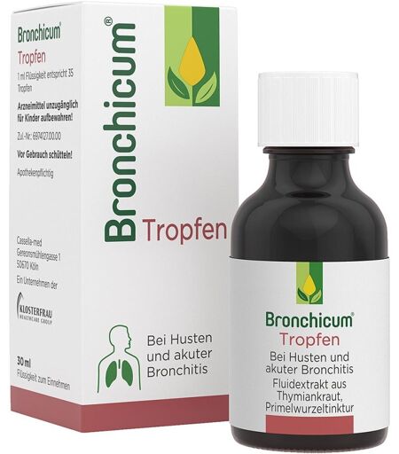 Anwendungsgebiet von Bronchicum - bei HustenBronchicum - bei Husten ist ein pflanzliches Arzneimittel bei Erkältungskrankheiten der Atemwege und findet Anwendung, um Symptome einer akuten Bronchitis und Erkältungskrankheiten der Atemwege mit zähem Schleim zu behandeln. Bronchicum - bei Husten kann bei Kindern ab 6 Jahren angewendet werden.Wirkungsweise von Bronchicum - bei HustenBronchicum - bei Husten ist hochkonzentriert und somit ideal für die Anwendung bei Erwachsenen geeignet. Die Tropfen helfen, Schleim zu lösen und dadurch die gereizten Bronchien zu beruhigen.Wirkstoffe / Inhaltsstoffe / ZutatenBronchicum - bei Husten enthält: Fluidextrakt aus Thymiankraut, Primelwurzeltinktur. 100 g (entsprechend 92,081 ml) Flüssigkeit enthalten: Fluidextrakt aus Thymiankraut (1 : 2 - 2,5), Auszugsmittel: Ammoniaklösung 10% (m/m), Glycerol 85%, Ethanol 90% (V/V), Wasser (1 : 20 : 70 : 109) 40 g, Tinktur aus Primelwurzel (1 : 5), Auszugsmittel: Ethanol 50% (V/V) 20 g. Die sonstigen Bestandteile sind: Sucrose-Invertzucker-Gemisch, Eukalyptusöl, Levomenthol, gereinigtes Wasser. 1 ml entspricht 35 Tropfen. GegenanzeigenBei bekannter Überempfindlichkeit gegenüber einen der oben genannten Inhaltsstoffe sollte das Produkt nicht angewendet werden.DosierungAnwendungsempfehlung von Bronchicum - bei Husten: Falls nicht anders vom Arzt verordnet, ist die übliche Dosis: Kinder ab 6 - 12 Jahre (ca. 20 - 43 kg) Einzeldosis: 30 Tropfen, 3- bis 5-mal täglich Tagesgesamtdosis: 90 - 150 Tropfen (entspricht 1,8 g Thymianfluidextrakt und 0,9 g Primeltinktur pro Tag) Heranwachsende ab 12 Jahre und Erwachsene Einzeldosis: 35 Tropfen, 5-mal täglich Tagesgesamtdosis: 175 Tropfen (entspricht 2,2 g Thymianfluidextrakt und 1,1 g Primeltinktur pro Tag) Zur Anwendung bei Kindern unter 6 Jahren liegen keine ausreichenden Untersuchungen vor, daher ist das Arzneimittel nicht zur Anwendung bei Kinde ...