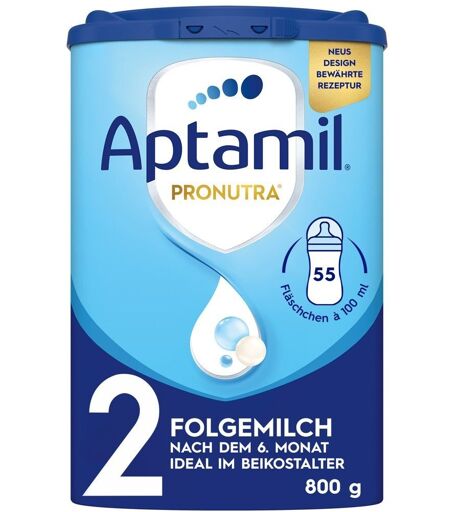Muttermilch ist die ideale Nahrung für Säuglinge in den ersten Monaten. Sie ist gut verdaulich und so zusammengesetzt, dass sie im ersten Lebenshalbjahr den Bedarf an Nährstoffen und Flüssigkeit deckt. Bei alternativer Ernährung mit Muttermilchersatzprodukten beachten Sie die Hinweise und Zubereitungsanleitungen auf den Packungen genau, denn eine unsachgemäße Zubereitung von Säuglingsanfangsnahrung kann zu gesundheitlichen Beeinträchtigungen führen.Wir empfehlen, sich vor Anwendung von Muttermilchersatznahrung ärztlich beraten zu lassen.Bitte achten Sie auf eine abwechslungsreiche und ausgewogene Ernährung und gesunde Lebensweise. Aptamil® 2 Pronutra+ Folgenahrung nach dem 6. MonatAptamil Pronutra 2 Folgemilch - Das Original. Beliebt, bewährt und stets weiterentwickelt.Dieses beliebte, bewährte und stets weiterentwickelte Folgemilch unterstützt kleine Immunsysteme. Damit ist dein Baby nach dem Stillen gut versorgt. Aptamil Pronutra Folgemilch beinhaltet den schonenden Lactofidus®-Herstellungsprozess und die einzigartige GOS/FOS Ballaststoffmischung. Durch die Immuno-Nährstoffe Vitamin C&D unterstützt Aptamil Pronutra Folgemilch das Immunsystem Ihres Babys. Aptamil ist die Nr. 1 Folgemilch in Deutschland.Eure Milchmomente sind so individuell wie ihr. Aptamil bietet hochwertige Folgemilchen an, die perfekt auf eure individuellen Bedürfnisse abgestimmt sind. Überzeugt euch selbst vom breiten Portfolio und findet heraus, welche Folgemilch für eure Bedürfnisse am Besten geeignet ist:Zutaten: Lactose (aus Milch), pflanzliche Öle, Magermilch, Molkenproteinkonzentrat (aus Milch), Stärke, Oligosaccharide (Galactooligosaccharide (aus Milch), Fructooligosaccharide), Maltodextrin, Calciumcarbonat, Fischöl, Kaliumcitrat, Calciumchlorid, Cholinchlorid, Vitamin C, Taurin, Emulgator (Sojalecithin), Eisen-II-Sulfat, Calciumorthophosphat, Magnesiumchlorid, Inositol, Vitamin E, Zinksulfat, L-Trypthophan, Nucleotide (Natriumsalze von Cytidin-, Uridin-, Inosin-, Adenosin-, Guanosin-5- monophosphaten), Niacin, L-Carnitin, Pantothensäure, Folsäure, Kupfersulfat, Vitamin A, Biotin, Vitamin B1, Vitamin D, Vitamin B12, Vitamin B6, Vitamin B2, Mangan-II-Sulfat, Kaliumjodid, Vitamin K, Natriumselenit.Nährwertangaben: Zusammensetzungpro 100 mlEnergie285 kJ/ 68 kcalEiweiß1,4 gMolke/Casein Verhältnis50/50Phenylalanin57 mgKohlenhydrate8,6 gdavonLactose6,1 gStärke1,2 gFett3 gdavongesättigte Fettsäuren1,2 geinfach ungesättigte Fettsäuren1,1 gmehrfach ungesättigte Fettsäuren0,5 gLinolsäure w-60,4 ga-Linolsäure w-30,07 gLCP20 mgBallaststoffe0,6 gMineralstoffeNatrium23 mgKalium74 mgChlorid47 mgCalcium65 mgPhosphor36 mgMagnesium4,8 mgEisen1 mgZink0,51 mgKupfer43 µg Mangan7,1 µg Selen1,7 µg Jod13 µg Fluorid< 2,9 µg VitamineVitamin A66 µg Vitamin D1,4 µg Vitamin E1,2 mgVitamin K5,1 µg Vitamin B10,05 mgVitamin B20,12 mgVitamin B60,04 mgNiacin0,43 mgPantothensäure0,34 mgFolsäure16 µg Vitamin B120,18 µg Biotin1,4 µg Vitamin C9,9 mgL-Caritin0,95 mgCholin10 mgInositol3,6 mgTaurin5,2... ...