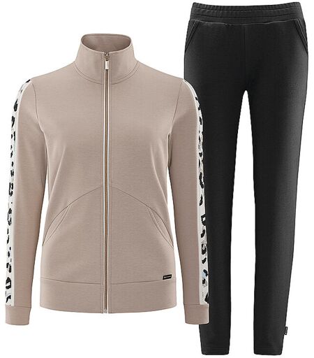 Jacke: Stehkragen Durchgehender Reißverschluss Langarm Seitliche Eingrifftaschen Stylischer Leo Print Bündchen an Ärmel und Saum Hose: Elastischer Bund Seitliche Eingrifftaschen Konischer Beinverlauf Material: 85% Baumwolle, 25% Polyester, 10% Elasthan Farbbezeichnung: Almound/Schwarz ...