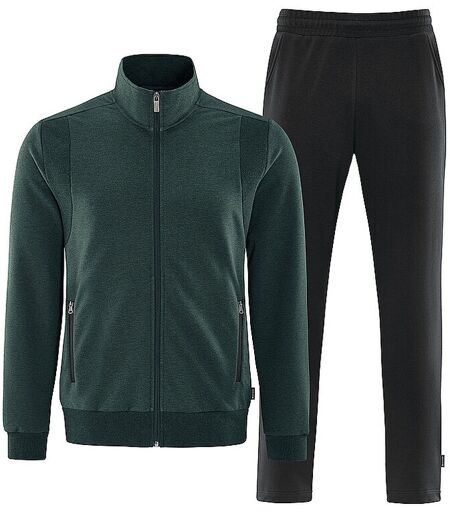 Jacke: Stehkragen Langarm Durchgehender Reißverschlss Seitliche Eingrifftaschen mit Reißverschluss Kontrastierendes Muster Hose: Elastischer Bund Seitliche Eingrifftaschen Konischer Beinverlauf Unifarben Material: 93% Baumwolle, 7% Elasthan Farbbezeichnung: Mysticmoss-Meliert ...