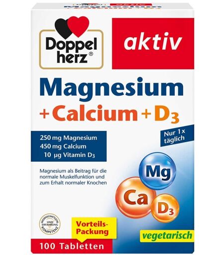 Anwendungsgebiet von Doppelherz Magnesium + Calcium + D3 TablettenDoppelherz Magnesium + Calcium + D3 Tabletten sind wichtig für Herz, Knochen und Nerven. Mit Doppelherz Magnesium + Calcium + D3 Tabletten versorgen Sie Ihren Körper mit zwei lebenswichtigen Mineralstoffen. Magnesium ist wichtig für die Energieversorgung unserer Körperzellen, die Funktion der Nervenzellen und der Muskeln sowie für den Herzmuskel, der Tag für Tag belastet wird. Calcium ist ein wesentlicher Bestandteil von der Körpersubstanz (Knochen, Zähne) und lebensnotwendig für die Aufrechterhaltung von Knochenaufbau und -erhaltung, Reizübertragung in Nerven und Zellen, Muskelfunktion, Blutgerinnung sowie Allergieschutz. Wirkstoffe / Inhaltsstoffe / ZutatenDoppelherz Magnesium + Calcium + D3 Tabletten enthält: Zutaten: Calciumcarbonat, Magnesiumoxid, Füllstoff mikrokristalline Cellulose, Füllstoff Polyvinylpyrrolidon, Überzugsmittel Hydroxypropylmethylcellulose, Trennmittel Speisefettsäuren, Trennmittel vernetzte Natriumcarboxymethylcellulose, Trennmittel Magnesiumsalze der Speisefettsäuren, Füllstoff Polyethylenglycol, Cholecalciferol Zusammensetzung pro Tagesportion (= 1 Tablette) % NRV* Magnesium 250 mg 67 % Calcium 450 mg 56 % Vitamin D 10 μg 200 % * Nährstoffbezugswerte gemäß EU-Verordnung 1169/2011DosierungSchon 1 Doppelherz Magnesium + Calcium + D3 Tabletten kann zusammen mit dem durch die Nahrung aufgenommenen Magnesium und Calcium, den durchschnittlichen Tagesbedarf eines Erwachsenen an diesen Mineralstoffen decken.Hinweise1 Tablette entspricht 0,9 ckal/3,6kJ und 0,01 BE. Die angegebene empfohlene tägliche Verzehrsmenge darf nicht überschritten werden. Nahrungsergänzungsmittel sind kein Ersatz für eine ausgewogene und abwechslungsreiche Ernährung und gesunde Lebensweise. Für kleine Kinder unzugänglich aufbewahren. Doppelherz Magnesium + Calcium + D3 Tabletten können in Ih ...