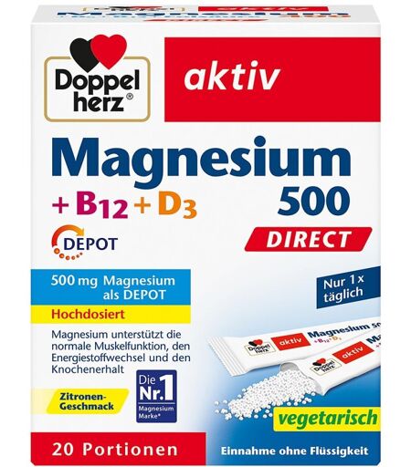 Anwendungsgebiet von Doppelherz Magnesium 500 + B12 + D3 DEPOT DIRECTDoppelherz Magnesium 500 + B12 + D3 DEPOT DIRECT unterstützt die Vitamin- und Mineralstoff versorgung mit einer Kombination aus Magnesium als DEPOT sowie Vitamin B12 + Vitamin D3. Wohlschmeckend + besonders leicht einzunehmen. Aus den feinen Granulatperlen mit „DEPOT-Effekt“ werden 500 mg Magnesium über viele Stunden nach und nach freigegeben und dem Körper so anhaltend durch kleinere „Portionen“, über den Tag verteilt, zur Verfügung gestellt. Micro-Pellets bieten eine moderne Darreichungsform für die schnelle und direkte Einnahme. Die feinen Granulatperlen können jederzeit und überall ganz ohne Flüssigkeit eingenommen werden. Ideal für unterwegs oder bei Einnahmeschwierigkeiten von Tabletten. Magnesium leistet einen Beitrag zum normalen Energiestoffwechsel und zur normalen Funktion von Muskeln und des Nervensystems. Außerdem trägt der Mineralstoff zum Elektrolytausgleich bei. Vitamin B12 trägt zu einem normalen Energiestoffwechsel und zur Verringerung von Müdigkeit und Erschöpfung bei. Vitamin D trägt zum Erhalt normaler Knochen und einer normalen Muskelfunktion bei.Wirkstoffe / Inhaltsstoffe / ZutatenZutaten von Doppelherz Magnesium 500 + B12 + D3 DEPOT DIRECT:Magnesiumoxid, Füllstoff Sorbit, Säureregulator Mononatriumcitrat, Palmfett (ganz gehärtet), Füllstoff Xylit, Säuerungsmittel Citronensäure, Verdickungsmittel Natrium-Carboxymethylcellulose, Aroma, Magnesiumcitrat, Süßungsmittel Aspartam, Süßungsmittel Acesulfam-K, Trennmittel Magnesiumsalze der Speisefettsäuren, Vitamin B12, Vitamin DGegenanzeigenBei bekannter Überempfindlichkeit gegenüber einen der oben genannten Inhaltsstoffe sollte dieses Produkt nicht angewendet werden.DosierungVerzehrempfehlung von Doppelherz Magnesium 500 + B12 + D3 DEPOT DIRECT:Täglich den Inhalt eines Beutels verzehren. Das Granulat direkt auf die Zunge geben, langsam zergehen lassen und schlucken. Bitte den Beutel in Pfeilrich ...