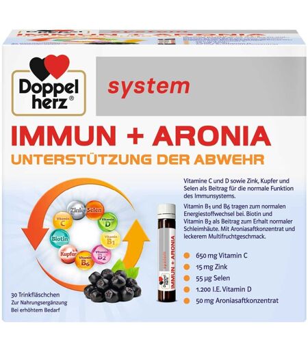 Anwendungsgebiet von Doppelherz Immun+Aronia System AmpullenDoppelherz Immun+Aronia System Ampullen sind ein Nahrungsergänzungsmittel, unterstützt bei einem erhöhtem Bedarf den Körper mit wertvollen Nährstoffen. Ideal für unterwegs - sofort trinkfertig mit einem leckerem Multifruchtgeschmack. Doppelherz Immun+Aronia System Ampullen enthält neben dem Saftkonzentrat aus Aroniabeeren, die sich durch einen angenehm herb-kräftigen Geschmack auszeichnen, eine spezielle Kombination aus 9 Mikronährstoffen, die zur Unterstützung der normalen Funktion des Immunsystems, des Energiestoffwechsels, zum Schutz der Zellen sowie zum Erhalt normaler Schleimhäute beiträgt: Vitamin C und Zink leisten zusammen mit Vitamin D sowie den Spurenelementen Selen und Kupfer einen Beitrag für die normale Funktion des Immunsystems. Vitamin B2 und Biotin tragen zum Erhalt normaler Schleimhäute bei. Ausgesuchte B-Vitamine unterstützen den Energiestoffwechsel. In Phasen erhöhter Belastung kann sich der Bedarf an Mikronährstoffen erhöhen. Vitamin C trägt auch zu einer normalen Funktion des Immunsystems während und nach intensiver körperlicher Betätigung bei. Die positive Wirkung stellt sich ein, wenn zusätzlich zu der empfohlenen Tagesdosis an Vitamin C täglich 200 mg eingenommen werden. Neben ihrer Funktion für die Abwehrkräfte, leisten Vitamin C, Zink und Selen sowie Kupfer einen Beitrag zum Schutz der Zellen vor oxidativem Stress. Dies ist auch in Zeiten erhöhter Belastungen von Bedeutung.Die aufeinander abgestimmten Nährstoffe sind im praktischen Trinkfläschchen enthalten – sofort trinkfertig mit angenehm fruchtigen Geschmack – ideal für unterwegs. Wirkstoffe / Inhaltsstoffe / ZutatenDoppelherz Immun+Aronia System Ampullen enthält: Ein Trinkfläschchen 25 ml enthält: 50 mg Aroniasaftkonzentrat, 1,65 mg Vitamin B1, 2,1 mg Vitamin B2, 2,1 mg Vitamin B6, 75 μg Biotin, 650 mg Vitamin C, 30 μg Vitamin D, 0,15 mg Kupfer, 55 μg Selen, 15 m ...