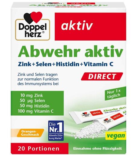 Anwendungsgebiet von Doppelherz aktiv Abwehr aktiv DIRECTDoppelherz aktiv Abwehr aktiv DIRECT sind ein Nahrungsergänzungsmittel mit Süßungsmittel, Granulat mit Zink, Selen, Vitamin C, Histidin und Orangen-Geschmack. Doppelherz aktiv Abwehr aktiv DIRECT versorgen unseren Körper gezielt mit den für unsere Immunabwehr und den Zellschutz wichtigen Nährstoffen Zink, Selen und Histidin. Die Darreichungsform Micro-Pellets erlaubt eine schnelle und einfache Einnahme ohne Wasser, ideal auch für unterwegs. Doppelherz aktiv Abwehr aktiv DIRECT haben einen frischen Orangengeschmack. Sie sind lactose- und glutenfrei.Wirkstoffe / Inhaltsstoffe / ZutatenZutaten von Doppelherz aktiv Abwehr aktiv DIRECT: Füllstoff Sorbit, L-Ascorbinsäure, L-Histidin 3,8 %, Füllstoff Mannit, Säureregulator Calciumcarbonat, Aroma, Säuerungsmittel Citronensäure, Zinkoxid, mittelkettige Triglyceride, Verdickungsmittel Natrium-Carboxymethylcellulose, Trennmittel Magnesiumsalze der Speisefettsäuren, Süßungsmittel Aspartam, Säureregulator Natriumcitrat, Natriumselenat Zusammensetzung pro Tagesportion (= 1 Beutel) % NRV* Zink 10 mg 100 % Selen 50 μg 91 % Vitamin C 100 mg 125 % L-Histidin 50 mg ** * Nährstoffbezugswerte gemäß EU-Verordnung 1169/2011 ** keine Nährstoffbezugswerte vorhandenGegenanzeigenBei bekannter Überempfindlichkeit gegen einen der oben genannten Inhaltsstoffe sollte dieses Produkt nicht angewendet werden. DosierungVerzehrempfehlung von Doppelherz aktiv Abwehr aktiv DIRECT:Nehmen Sie täglich den Inhalt eines Beutels als gezielte Nahrungsergänzung ein. Geben Sie die Micro-Pellets direkt auf die Zunge und lassen Sie sie langsam zergehen, bevor Sie sie schlucken. HinweiseNahrungsergänzungsmittel stellen keinen Ersatz für eine abwechslungsreiche Ernährung dar. Eine ausgewogene Ernährung und gesunde Lebensweise sind wichtig. Die empfohlene tägliche Verzehrmenge sollte nicht überschritten werden ...