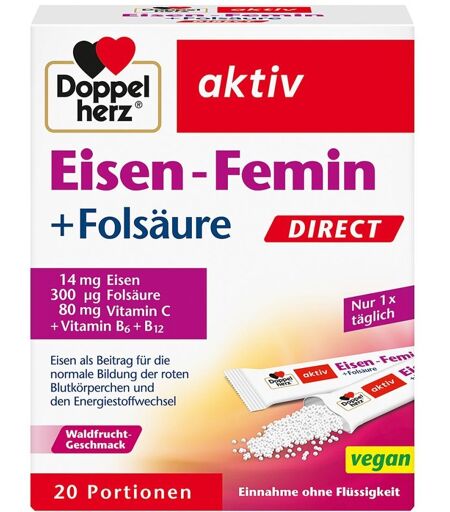Anwendungsgebiet von Doppelherz aktiv Eisen - Femin DIRECTDoppelherz aktiv Eisen - Femin DIRECT ist ein Nahrungsergänzungsmittel mit Süßungsmitteln - Granulat mit Eisen, Folsäure, Vitamin C, Vitamin B6, Vitamin B12 und Waldfrucht-Geschmack.Wirkstoffe / Inhaltsstoffe / ZutatenZutaten von Doppelherz aktiv Eisen - Femin DIRECT: Füllstoff Sorbit, Füllstoff Xylit, L-Ascorbinsäure, Eisenpyrophosphat, Säureregulator Mononatriumcitrat, Verdickungsmittel Natrium-Carboxymethylcellulose, Aroma, Süßungsmittel Acesulfam K, Süßungsmittel Aspartam, Pyridoxinhydrochlorid, Pteroylmonoglutaminsäure, Cyanocobalamin Nährstoffe von Doppelherz aktiv Eisen - Femin DIRECT: pro Tagesportion (= 1 Beutel) % NRV* Eisen 14 mg 100 % Folsäure 300 µg 150 % Vitamin B6 1,4 mg 100 % Vitamin B12 2,5 µg 100 % Vitamin C 80 mg 100 % * Nährstoffbezugswerte gemäß EU-Verordnung 1169/2011 Enthält eine Phenylalaninquelle.DosierungVerzehrempfehlung von Doppelherz aktiv Eisen - Femin DIRECT: Täglich den Inhalt eines Beutels verzehren. Die Micro - Pellets direkt auf die Zunge geben, langsam zergehen lassen und schlucken.HinweiseNahrungsergänzungsmittel stellen keinen Ersatz für eine abwechslungsreiche Ernährung dar. Eine ausgewogene Ernährung und gesunde Lebensweise sind wichtig. Die empfohlene tägliche Verzehrmenge sollte nicht überschritten werden. Außerhalb der Reichweite von kleinen Kindern aufbewahren. Kühl und trocken lagern. Doppelherz aktiv Eisen - Femin DIRECT können in Ihrer Versandapotheke www.juvalis.de erworben werden. ...