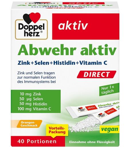 Anwendungsgebiet von Doppelherz Abwehr aktiv Direct PelletsDoppelherz Abwehr aktiv Direct Pellets sind ein Nahrungsergänzungsmittel mit Süßungsmittel, Granulat mit Zink, Selen, Vitamin C, Histidin und Orangen-Geschmack. Doppelherz Abwehr aktiv Direct Pellets versorgen unseren Körper gezielt mit den für unsere Immunabwehr und den Zellschutz wichtigen Nährstoffen Zink, Selen und Histidin. Die Darreichungsform Micro-Pellets erlaubt eine schnelle und einfache Einnahme ohne Wasser, ideal auch für unterwegs. Doppelherz Abwehr aktiv Direct Pellets haben einen frischen Orangengeschmack. Sie sind lactose- und glutenfrei.Wirkungsweise von Doppelherz Abwehr aktiv Direct PelletsZink und Selen sind zwei essentielle Spurenelemente, die unserem Körper täglich mit der Nahrung zugeführt werden müssen. So steuert Zink die Funktion von mehr als 200 Enzymen, die in alle wichtigen Stoffwechsel- und Steuervorgänge unseres Körper involviert sind. Selen ist ebenfalls als Bestandteil vieler Enzyme wichtig für unser Immunsystem und den Zellschutz. Beide Elemente zusammen sind für ein intaktes körpereigenes Abwehrsystem von enormer Bedeutung. Histidin ist als Zink-Verwertungshelfer Teil des Zink-Transportsystems. Es sorgt für die aktive Aufnahme und den gezielten Tarnsport dieses Spurenelements. Daneben wird Histidin für die Bildung des roten Blutfarbstoffes benötig, der für Sauerstoffbindung und -transport verantwortlich ist.Wirkstoffe / Inhaltsstoffe / ZutatenZutaten von Doppelherz Abwehr aktiv Direct Pellets: Füllstoff Sorbit, L-Ascorbinsäure, L-Histidin 3,8 %, Füllstoff Mannit, Säureregulator Calciumcarbonat, Aroma, Säuerungsmittel Citronensäure, Zinkoxid, mittelkettige Triglyceride, Verdickungsmittel Natrium-Carboxymethylcellulose, Trennmittel Magnesiumsalze der Speisefettsäuren, Süßungsmittel Aspartam, Säureregulator Natriumcitrat, Natriumselenat Zusammensetzung pro Tagesportion (= 1 Beutel) % NRV* Zink 10 mg ...