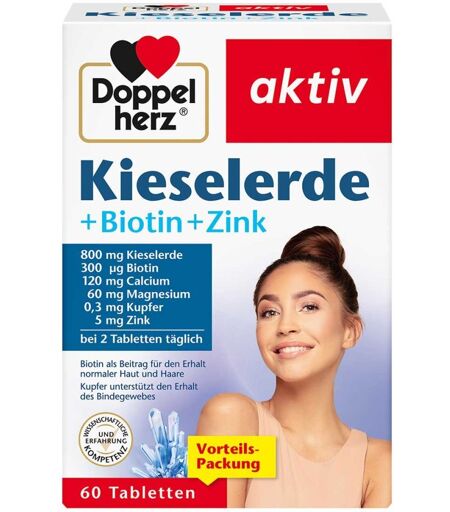 Anwendungsgebiet von Doppelherz Kieselerde + Biotin Tabletten Doppelherz Kieselerde + Biotin Tabletten setzt auf eine Kombination von natürlicher Kieselerde und Mineralstoffen, die eine ausreichende Versorgung mit lebensnotwendigen und stoffwechselrelevanten Nährstoffen gewährleistet.Wirkungsweise von Doppelherz Kieselerde + Biotin TablettenDoppelherz Kieselerde + Biotin Tabletten enthält eine ideale Mineralstoffkombination: Natürliche Kieselerde ist reich an Silicium sowie Sauerstoff und fördert eine gesunde Struktur und festen Halt von Haut, Haaren, Nägeln und Bindegewebe. Calcium ist ein lebensnotwendiger Mineralstoff, der zum Knochenerhalt beiträgt und einen Beitrag zur Muskelfunktion und Reizübertragung leistet. Magnesium spielt eine Rolle bei der Aktivierung von Enzymen und unterstützt den Energiestoffwechsel, die normale Funktion des Nervensystems und der Muskeln. Biotin fördert die Gesundheit und den Zellstoffwechsel von Haut, Haaren und Nägeln. Zink unterstützt die normale Funktion des Immunsystems und spielt eine Rolle für den Schutz der Zellbestandteile vor oxidativen Schäden. Das lebenswichtige Spurenelement leistet zusätzlich einen Beitrag zur Gesunderhaltung der Haut. Wirkstoffe / Inhaltsstoffe / ZutatenDoppelherz Kieselerde + Biotin Tabletten enthält: Zutaten: Kieselerde, Füllstoffe Sorbit, Calciumcarbonat, Füllstoff mikrokristalline Cellulose, Füllstoff Polyvinylpyrrolidon, Magnesiumoxid, Palmfett (ganz gehärtet), Trennmittel Siliciumdioxid, Überzugsmittel Hydroxypropylmethylcellulose, Stärke, Füllstoff Cellulosepulver, Emulgator Mono- und Diglyceride von Speisefettsäuren, Trennmittel Magnesiumhydroxidcarbonat, Trennmittel Magnesiumsalze der Speisefettsäuren, Zinksulfat, Füllstoff Gummi arabicum, Füllstoff Hydroxypropylcellulose, Überzugsmittel Polythylenglycol, Trennmittel Talkum, Kupfersulfat, D-Biotin Zusammensetzung pro Tablette pro Tag ...