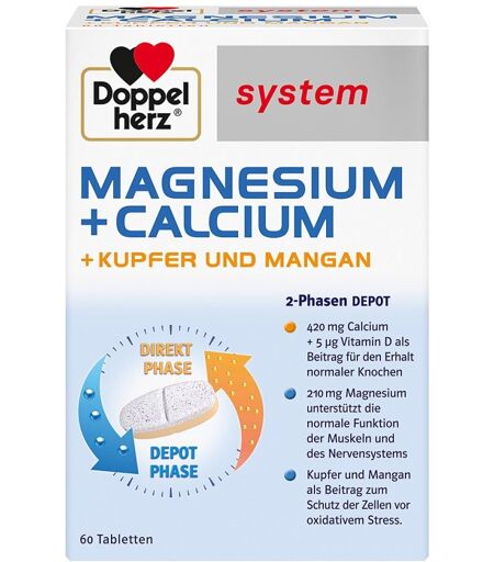 Wirkstoffe / Inhaltsstoffe / ZutatenZutaten von Doppelherz system Magnesium + Calcium: Calciumcarbonat, Magnesiumoxid, Füllstoffe mikrokristalline Cellulose und Polyvinylpyrrolidon, Trennmittel Carboxymethylcellulose, Speisefettsäuren, Magnesiumsalze der Speisefettsäuren, Talkum und Siliciumdioxid, Überzugsmittel Hydroxypropylmethylcellulose und Hydroxypropylcellulose, Stärke, Maltodextrin, Rote Beete Saftpulver, Farbstoff Eisenoxide und Eisenhydroxide, Mangansulfat, pflanzliche Öle (Kokos, Palm, in veränderlichen Gewichtsanteilen), Kupfersulfat, Cholecalciferol Zusammensetzungpro Tagesportion (= 1Tablette)% NRV* Magnesium210 mg56 % Calcium420 mg52,5 % Vitamin D5 µg100 % Kupfer500 µg50 % Mangan1,0 mg50 % * Nährstoffbezugswerte gemäß EU-Verordnung 1169/2011GegenanzeigenBei bekannter Überempfindlichkeit gegenüber einem der oben genannten Inhaltsstoffe sollte dieses Produkt nicht angewendet werden.DosierungTäglich 1 Tablette zu einer Mahlzeit mit ausreichend Flüssigkeit unzerkaut einnehmen. HinweiseDie angegebene empfohlene tägliche Verzehrsmenge darf nicht überschritten werden. Nahrungsergänzungsmittel sind kein Ersatz für eine ausgewogene und abwechslungsreiche Ernährung und gesunde Lebensweise. Für kleine Kinder unzugänglich aufbewahren. Doppelherz system Magnesium + Calcium können in Ihrer Versandapotheke www.juvalis.de erworben werden. ...