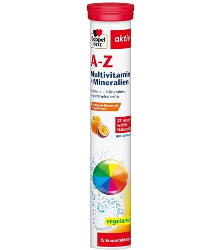 Anwendungsgebiet von Doppelherz A-z Multivitamin+mineralien BrausetablettenDie Doppelherz A-z Multivitamin+mineralien Brausetabletten aus Ihrer Versandapotheke liefern viele lebensnotwendigen Vitaminen, Mineralstoffe und Spurenelemente, die absolut wichtig für Gesundheit und Wohlbefinden sind. Sie sind die Voraussetzung für jegliche Form der Leistungsfähigkeit. Schon 1 Brausetablette der Doppelherz A-z Multivitamin+mineralien Brausetabletten versorgt Sie mit 21 wichtigen Nährstoffen - von Vitamin A bis zum Spurenelement Zink. Die Rundumversorgung ermöglicht ein gesünderes und vitaleres Leben. Da die Nährstoffe bei der Einnahme in flüssiger Form vorliegen, können sie besonders schnell vom Körper aufgenommen werden. Die Doppelherz A-z Multivitamin+mineralien Brausetabletten erfrischen mit leckerem Blutorange-Maracuja-Geschmack.Wirkungsweise von Doppelherz A-z Multivitamin+mineralien BrausetablettenDie Doppelherz A-z Multivitamin+mineralien Brausetabletten enthalten sorgfältig aufeinander abgestimmte Vitamine, Mineralstoffe und Spurenelemente. Diese Vitalstoffe sind für den menschlichen Körper und dessen Stoffwechsel einfach unentbehrlich. Sie sind an praktisch allen Vorgängen im Körper beteiligt. Die Doppelherz A-z Multivitamin+mineralien Brausetabletten stärken somit den ganzen Körper – angefangen vom Immunsystem bis zur Funktionstüchtigkeit und Leistungsfähigkeit.Wirkstoffe / Inhaltsstoffe / Zutaten1 Tablette von Doppelherz A-z Multivitamin+mineralien Brausetabletten enthält: Vitamin A 400 µg RE, Biotin 75 µg, Vitamin B1 1,65 mg, Vitamin B2 2,1 mg, Vitamin B6 2,1 mg, Vitamin B12 3,75 µg, Vitamin C 200 mg, Vitamin D 5,0 µg, Vitamin E 12 mg alpha-TE, Folsäure 400 µg, Vitamin K 20 µg, Niacin 16 mg NE, Pantothensäure 6 mg, Calcium 200 mg, Magnesium 100 mg, Phosphor 125 mg, Chrom 12 µg, Jod 100 µg, Molybdän 12,5 µg, Selen 30 µg, Zink 5 mg Zutatenliste: Apfelsäure, Citronensäure, Natri ...