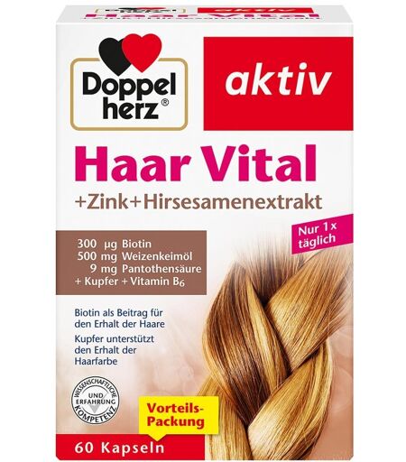 Anwendungsgebiet von Doppelherz Haar Vital+zink+hirseextrakt KapselnDoppelherz Haar Vital+zink+hirseextrakt Kapseln ist ein Nahrungsergänzungsmittel für den Aufbau und das Wachstum von kräftigem und gesunden Haar. Eine ausgewogene Kombination aus wichtigen Mineralstoffen, lebensnotwendigen Vitaminen, ungesättigten Fettsäuren und Spurenelementen vitalisiert die Haarstruktur und leistet einen entscheidenden Beitrag für den Aufbau von Haarsubstanz.Wirkungsweise von Doppelherz Haar Vital+zink+hirseextrakt KapselnDoppelherz Haar Vital+zink+hirseextrakt Kapseln enthält Hirse, das den Aufbau der Haarsubstanz durch wertvolle Nährstoffe unterstützt. Weitere Nährstoffe wie Zink, Biotin, Pantothensäure und Vitamin B6 gewährleisten lebensnotwendige Stoffwechsel Prozesse des Körpers und sind maßgeblich bei dem Zellaufbau und der Zellversorgung beteiligt. Der Zusatz an Vitamin C gewährleistet zusätzlich den Schutz der Zellen. Wirkstoffe / Inhaltsstoffe / ZutatenEine Kapsel von Doppelherz Haar Vital+zink+hirseextrakt Kapseln enthält: WEIZENKEIMÖL 43,5 %, Gelatine (Rind), Hirsesamenextrakt 13 %, Feuchthaltemittel Glycerin, SOJAÖL (teilweise gehärtet), Stabilisator Bienenwachs gelb, Feuchthaltemittel Sorbit, Zinksulfat, Emulgator SOJALECITHINE, Calcium-D-pantothenat, Pyridoxinhydrochlorid, Kupfersulfat, Biotin, Farbstoff Eisenoxide und Eisenhydroxide Zusammensetzung pro Tagesportion (= 1 Kapsel) % NRV* Zink 5 mg 50 % Kupfer 150 μg 15 % Biotin 300 μg 600 % Pantothensäure 9 mg 150 % Vitamin B6 1 mg 71 % Hirsesamenextrakt 150 mg ** Weizenkeimöl 500 mg ** * Nährstoffbezugswerte gemäß EU-Verordnung 1169/2011 ** keine Nährstoffbezugswerte vorhanden GegenanzeigenBei bekannter Überempfindlichkeit gegen einen der Inhaltsstoffe sollte dieses Produkt nicht angewendet werden.DosierungVerzehrempfehlung: Nehmen Sie täglich eine Kapsel von Doppelherz Haar Vital+zink+hirse ...
