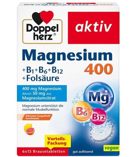 Anwendungsgebiet von Doppelherz Magnesium 400+b1+b6+b12+folsäure BtaDoppelherz Magnesium 400+b1+b6+b12+folsäure Bta ist ein Nahrungsergänzungsmittel mit Süßungsmitteln. Brausetabletten mit Magnesium und B-Vitaminen.Wirkungsweise von Doppelherz Magnesium 400+b1+b6+b12+folsäure BtaDas Besondere an Doppelherz Magnesium 400+b1+b6+b12+folsäure Bta Eine optimale Versorgung mit Vitaminen und Mineralstoffen ist eine wichtige Voraussetzung für das Wohlbefinden und die Leistungsfähigkeit unseres Körpers. Magnesium ist ein lebensnotwendiger Mineralstoff, den der Körper nicht selbst bilden kann. Außerdem ist eine Speicherung nur in begrenztem Umfang möglich. Magnesium leistet einen Beitrag zur normalen Funktion des Nervensystems, zur Muskelfunktion und zum normalen Energiestoffwechsel sowie zum Elektrolytausgleich. Die Brausetabletten von Doppelherz enthalten neben 400 mg Magnesium, davon 50 mg Magnesium in Form von Magnesiumcitrat, ausgewählte B-Vitamine, einschließlich der Folsäure. Für die normale Funktion des Nervensystems spielen die Vitamine B1, B6 und B12 eine Rolle. Folsäure hat eine Funktion bei der Zellteilung und leistet einen Beitrag zur normalen Blutbildung. Eine Nahrungsergänzung mit Doppelherz Magnesium 400+b1+b6+b12+folsäure Bta empfiehlt sich bei unausgewogener Ernährung oder einem erhöhten Nährstoffbedarf, z. B. bei körperlichen Anstrengungen wie Sport oder bei ungesunder Lebensweise (z. B. Tabak-/Alkoholgenuss).Wirkstoffe / Inhaltsstoffe / ZutatenDoppelherz Magnesium 400+b1+b6+b12+folsäure Bta enthalten: Säuerungsmittel Citronensäure, Magnesiumcarbonat, Säureregulatoren Natriumhydrogencarbonat und Natriumcarbonat, Trimagnesiumdicitrat, Süßungsmittel Natriumcyclamat und Natriumsaccharin, Aroma, Stärke, Vitamin B6, Vitamin B1, Folsäure, Farbstoff Riboflavin-5'-Phosphat, Vitamin B12 Zusammensetzung pro Tagesportion (= 1 Brausetablette) % NRV* Magnesium 400 mg 107 % Folsäure 600 µg 300 % Vita ...