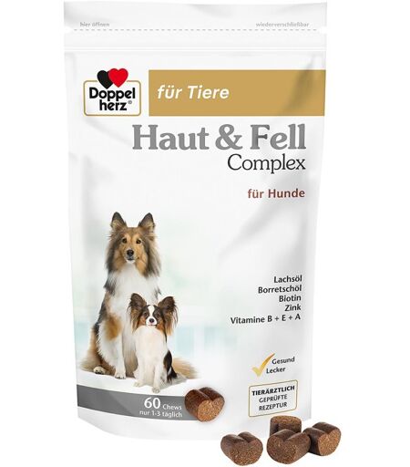 Anwendungsgebiet von Doppelherz für Tiere Haut & Fell Complex Chews für HundeDoppelherz für Tiere Haut & Fell Complex Chews für Hunde ist ein Ergänzungsfuttermittel für Hunde. Die leckeren Chews enthalten wertvolle Komponenten ohne künstliche Aromastoffe.Haut und Fell befinden sich in einem Zustand ständiger Erneuerung und benötigen hierfür mit der Nahrung zugeführte Nährstoffe. Besonders wertvoll für den Erhalt und die Regeneration der Haut sind die Spurenelemente Kupfer und Zink sowie die Vitamine B, E und A. Hefe dient als natürlicher Lieferant von Biotin und B-Vitaminen. Die Chews enthalten zudem Omega-3 und Omega-6 Fettsäuren aus Lachs- und Borretschöl.Doppelherz ist eine der bekanntesten Gesundheitsmarken Deutschlands. Bereits seit über 100 Jahren werden Gesundheitsprodukte mit hoher Qualität entwickelt, welche ausschließlich geprüfte und hochwertige Inhaltsstoffe beinhalten. Doppelherz steht heute für den Erhalt des gesunden Wohlbefindens der ganzen Familie – und somit natürlich auch von Hund und Katze.Wirkstoffe / Inhaltsstoffe / ZutatenDoppelherz für Tiere Haut & Fell Complex Chews für Hunde enthalten:Zusammensetzung:Putenfleisch, getrocknetes Geflügelprotein, Kartoffelstärke, Erbsenstärke, Glycerin, Bierhefe (10 %), Lachsöl (4 %), Apfeltrester, Borretschöl (1%), NatriumchloridAnalytische Bestandteile:Rohprotein 21,5 %, Rohfett 12 %, Rohfaser 2 %, Rohasche 8,5 %, Feuchtigkeit 20 %Zusatzstoffe (ernährungs-physiologisch) pro kg:183000 IE Vitamin A (3a672a), 6600 mg Vitamin E (3a700i), 167 mg Vitamin B1 (3a821), 250 mg Vitamin B2 (3a825ii), 833 mg Pantothensäure (3a841),133 mg Vitamin B6 (3a831), 133 μg Vitamin B12 (Cyanocobalamin), 667 mg Niacin (3a314), 416 mg Biotin (3a880), 250 mg Kupfer (3b413), 1000 mg Zink (3b607),Aromastoff: Rosmarin-ExtraktGegenanzeigenBei bekannter Überempfindlichkeit gegenüber einem der oben genannten Inhaltsstoffe sollte das Produkt nicht verwendet werden. DosierungFütterungsempfehlung von Doppe ...