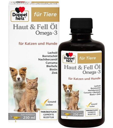 Anwendungsgebiet von Doppelherz für Tiere Haut & Fell Öl für Katzen und HundeDoppelherz für Tiere Haut & Fell Öl für Katzen und Hunde ist ein Ergänzungsfuttermittel für Katzen und Hunde. Die hochwertige Ölmischung enthält wertvolle Feststoffe, ohne Zusatz von Zucker, Farb- und Konservierungsstoffen.Haut und Fell befinden sich in einem Zustand ständiger Erneuerung und benötigen hierfür mit der Nahrung zugeführte Nährstoffe. Die wichtigen Omega-3 Fettsäuren EPA und DHA aus Lachsöl, Borretschöl und Nachtkerzenöl sind essentielle Nährstoffe für Haut und Talgdrüsen. Zusätzlich enthalten sind Curcuma, Bierhefe, Biotin, Zink und die wichtigen Vitaminen E und A. Diese stellen die Nährstoffversorgung der Haut sicher und stärken die Hautbarriere.Je nach Gewicht des Tieres werden 1 bis 3 Teelöffel täglich gegeben. Das schmackhafte Öl eignet sich perfekt zum Untermischen im Futter.Doppelherz ist eine der bekanntesten Gesundheitsmarken Deutschlands. Bereits seit über 100 Jahren werden Gesundheitsprodukte mit hoher Qualität entwickelt, welche ausschließlich geprüfte und hochwertige Inhaltsstoffe beinhalten. Doppelherz steht heute für den Erhalt des gesunden Wohlbefindens der ganzen Familie – und somit natürlich auch von Hund und Katze.Wirkungsweise von Doppelherz für Tiere Haut & Fell Öl für Katzen und Hunde Wirkstoffe / Inhaltsstoffe / ZutatenZutaten von Doppelherz für Tiere Haut & Fell Öl für Katzen und Hunde:Zusammensetzung:Lachsöl (86,8 %), Nachtkerzenöl (4,6 %), Borretschöl (4 %), Bierhefe (2,2 %)Analytische Bestandteile:Rohprotein 0,97 %, Rohfett 94,5 %, Rohfaser 0,75 %, Rohasche 1,2 %, Omega-3-Fettsäuren 11 %Zusatzstoffe (ernährungs-physiologisch) pro kg:Biotin (3a880) 165 mg, Zink (3b609) 1100 mg, Vitamin E (3a700) 11100 mg, Vitamin A (3a672a) 20720 IEAromastoff: Curcuma Extrakt 550 mgGegenanzeigenBei bekannter Überempfindlichkeit gegenüber einem der oben genannten Inhaltsstoffe sollte das Produkt nicht verwendet werde ...