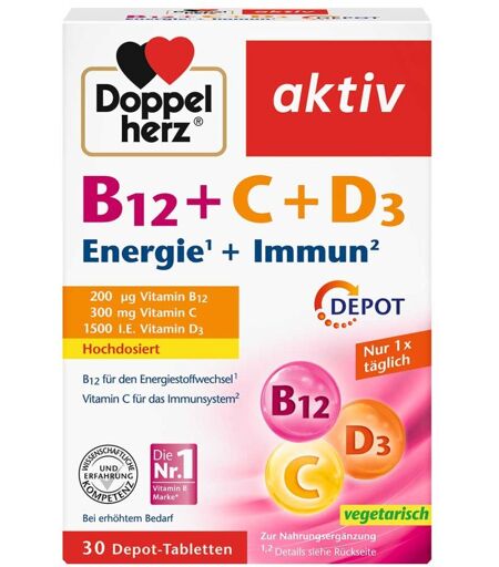 Anwendungsgebiet von Doppelherz B12+c+d3 DepotDoppelherz B12+c+d3 Depot ist ein Nahrungsergänzungsmittel und enthält Vitamin B12 für den Energiestoffwechsel in Kombination mit Vitamin C und Vitamin D zur Unterstützung der normalen Funktion des Immunsystems. So kann eine gute Vitaminversorgung bei erhöhtem Bedarf, einer unausgewogenen Ernährung oder bei nachlassender Vitamin B12-Verwertung im Alter unterstützt werden. Vitamin B12 trägt zu einem normalen Energiestoffwechsel und zur Verringerung von Müdigkeit und Erschöpfung bei. Zudem leistet es einen Beitrag zu einer normalen Funktion des Nervensystems und trägt zur normalen psychischen Funktion sowie zu einer normalen Bildung roter Blutkörperchen bei. Durch die Depot-Funktion werden die Nährstoffe über mehrere Stunden nach und nach freigegeben und dem Körper so anhaltend zur Verfügung gestellt. Wirkstoffe / Inhaltsstoffe / ZutatenDoppelherz B12+c+d3 Depot enthält: Füllstoff mikrokristalline Cellulose, L-Ascorbinsäure, Füllstoff Dicalciumphosphat, Füllstoff Hydroxypropylmethylcellulose, modifizierte Stärke, Trennmittel Speisefettsäuren, Trennmittel Magnesiumsalze der Speisefettsäuren, Stärke, Trennmittel Talkum, Trennmittel Siliciumdioxid, Feuchthaltemittel Glycerin, Farbstoff Eisenoxide und Eisenhydroxide, Cyanocobalamin, Cholecalciferol pro Tagesportion (= 1 Tablette): Inhaltsstoffe Menge Vitamin B12 200 µg Vitamin C 300 mg Vitamin D 37,5 µg DosierungVerzehrempfehlung von Doppelherz B12+c+d3 Depot: Täglich 1 Tablette mit ausreichend Flüssigkeit zu einer Mahlzeit unzerkaut einnehmen. Weitere Vitamin D-haltige Präparate sollten nicht ohne ärztliche Rücksprache eingenommen werden.HinweiseDie angegebene empfohlene tägliche Verzehrsmenge darf nicht überschritten werden. Nahrungsergänzungsmittel sind kein Ersatz für eine ausgewogene und abwechslungs-reiche Ernährung und eine gesunde Lebensweise.Für kleine ...