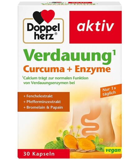 Anwendungsgebiet von Doppelherz Verdauung Curcuma+enzyme KapselnDoppelherz Verdauung Curcuma+enzyme Kapseln sind ein Nahrungsergänzungsmittel mit Curcumawurzelextrakt, Pfefferminzblätterextrakt, Fenchelsamenextrakt, Bromelain, Papain, Calcium und Zink.Wirkstoffe / Inhaltsstoffe / ZutatenZutaten von Doppelherz Verdauung Curcuma+enzyme Kapseln: Calciumcarbonat, curcuminhaltiger Curcumawurzelextrakt, Hydroxypropylmethylcellulose, Pfefferminzblätterextrakt, Fenchelsamenextrakt, Papain, Bromelain, Zinkgluconat, Maltodextrin, Trennmittel Magnesiumsalze der Speisefettsäuren GegenanzeigenBei bekannter Überempfindlichkeit gegenüber einen der oben genannten Inhaltsstoffe sollte dieses Produkt nicht angewendet werden.DosierungVerzehrempfehlung von Doppelherz Verdauung Curcuma+enzyme Kapseln: Täglich 1 Kapsel zu einer Mahlzeit mit ausreichend Flüssigkeit unzerkaut einnehmen. HinweiseNahrungsergänzungsmittel stellen keinen Ersatz für eine abwechslungsreiche Ernährung dar. Eine ausgewogene Ernährung und gesunde Lebensweise sind wichtig. Die empfohlene tägliche Verzehrmenge sollte nicht überschritten werden. Außerhalb der Reichweite von kleinen Kindern aufbewahren. Kühl und trocken lagern. Wenn Sie gleichzeitig Medikamente einnehmen, sollten Sie den Verzehr mit Ihrem Arzt besprechen. Für Kinder, Jugendliche, Schwangere und Stillende nicht geeignet. Doppelherz Verdauung Curcuma+enzyme Kapseln können in Ihrer Versandapotheke www.juvalis.de erworben werden. ...